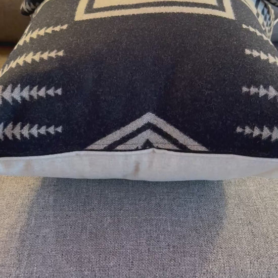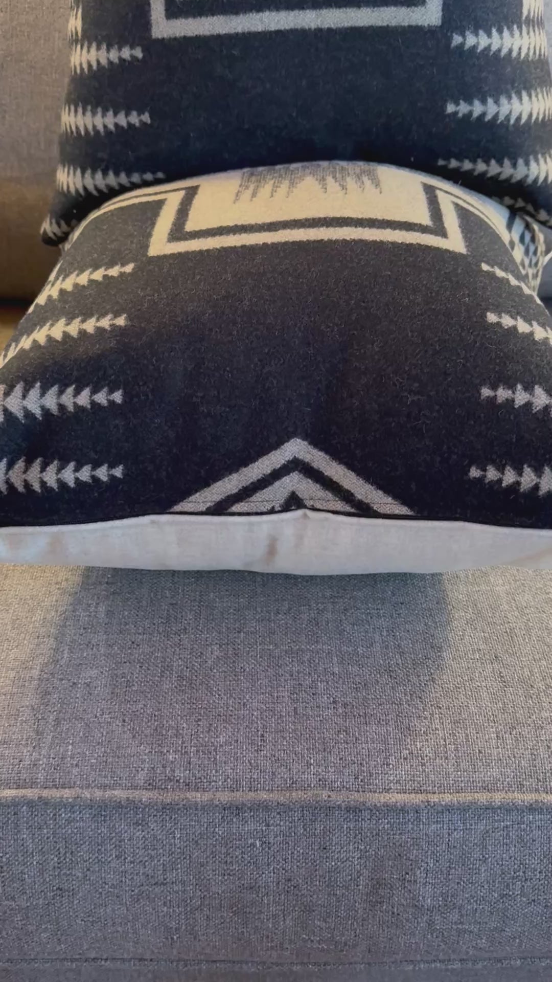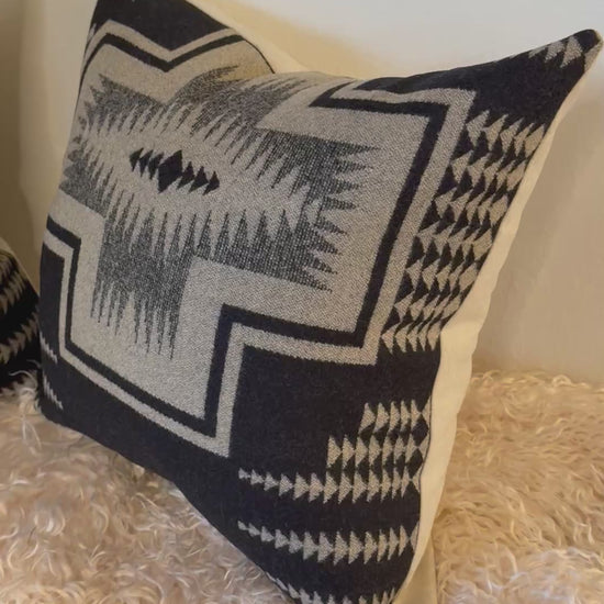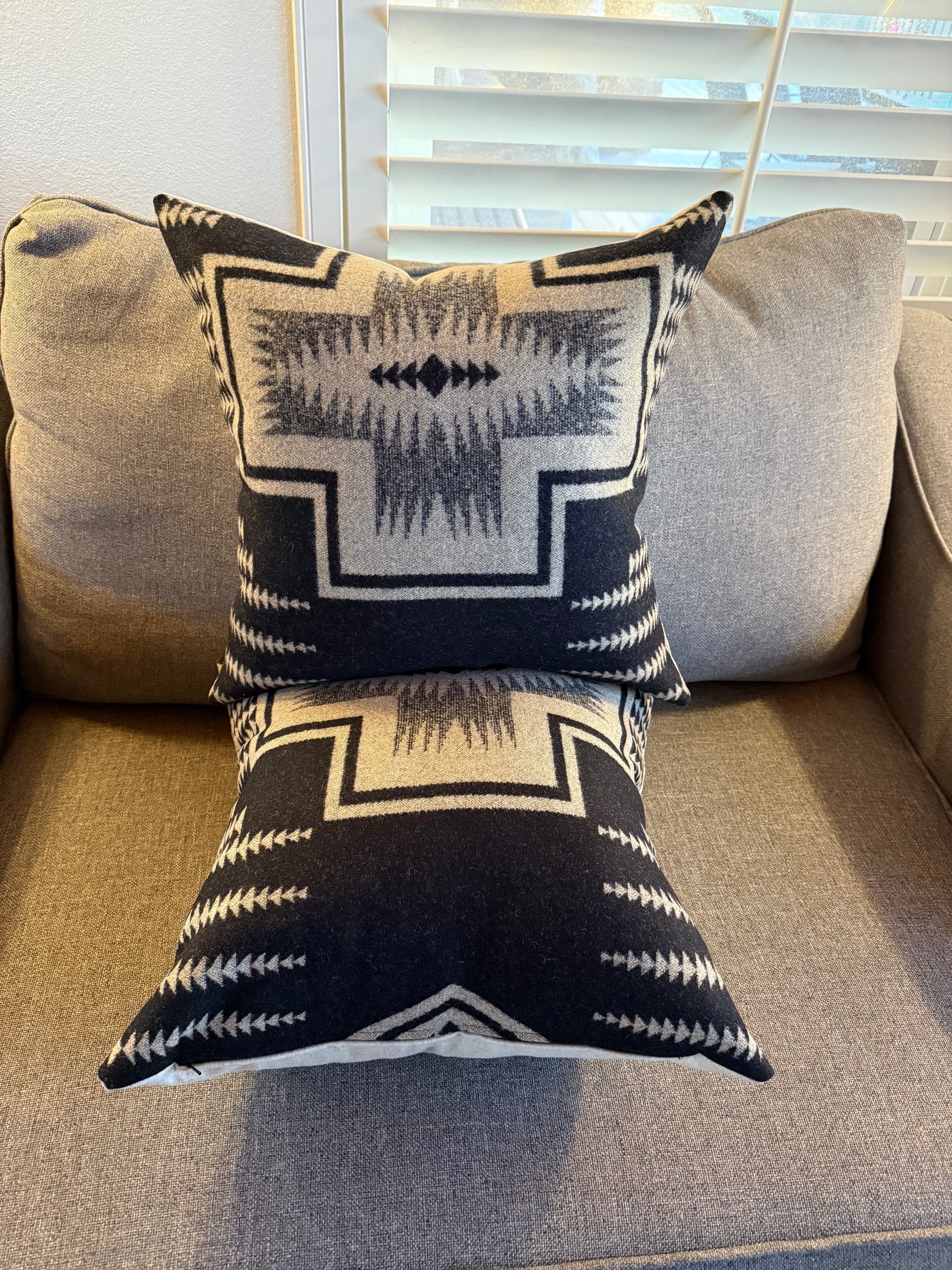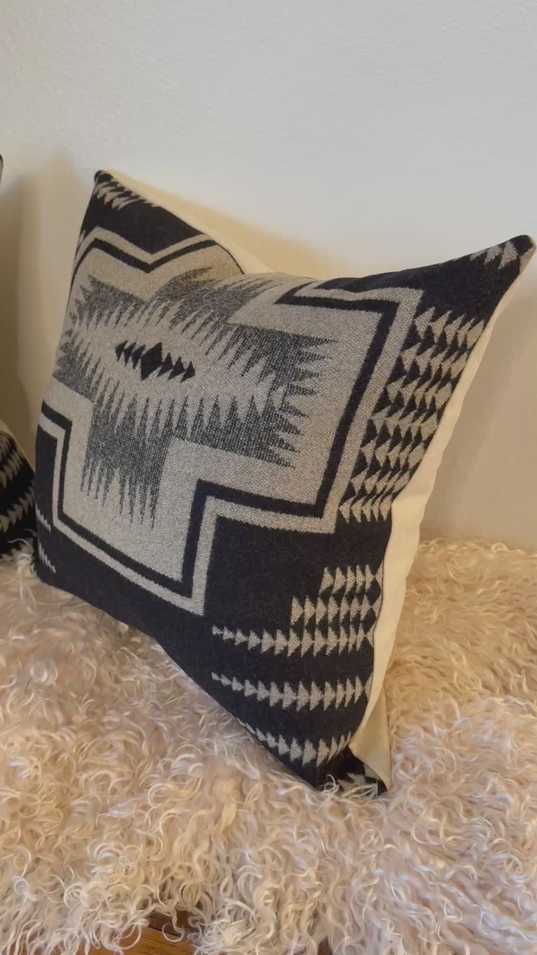 This set of pillows is made with Black & Tan Harding and Cream Pendleton® fabrics. The pillows have YKK zippers and are stuffed with 20x20 pillow inserts.