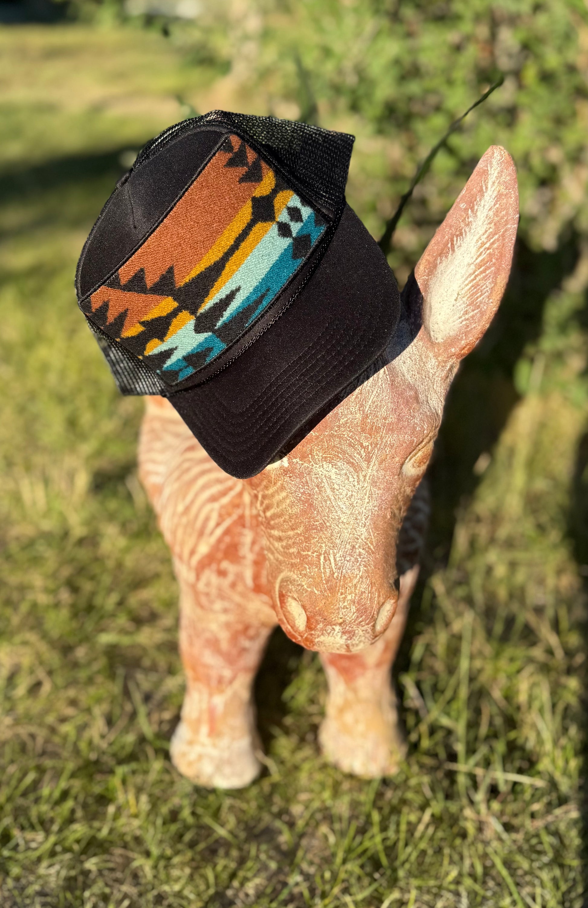 Black trucker hat with Pendleton® fabric patch & embroidered edge.