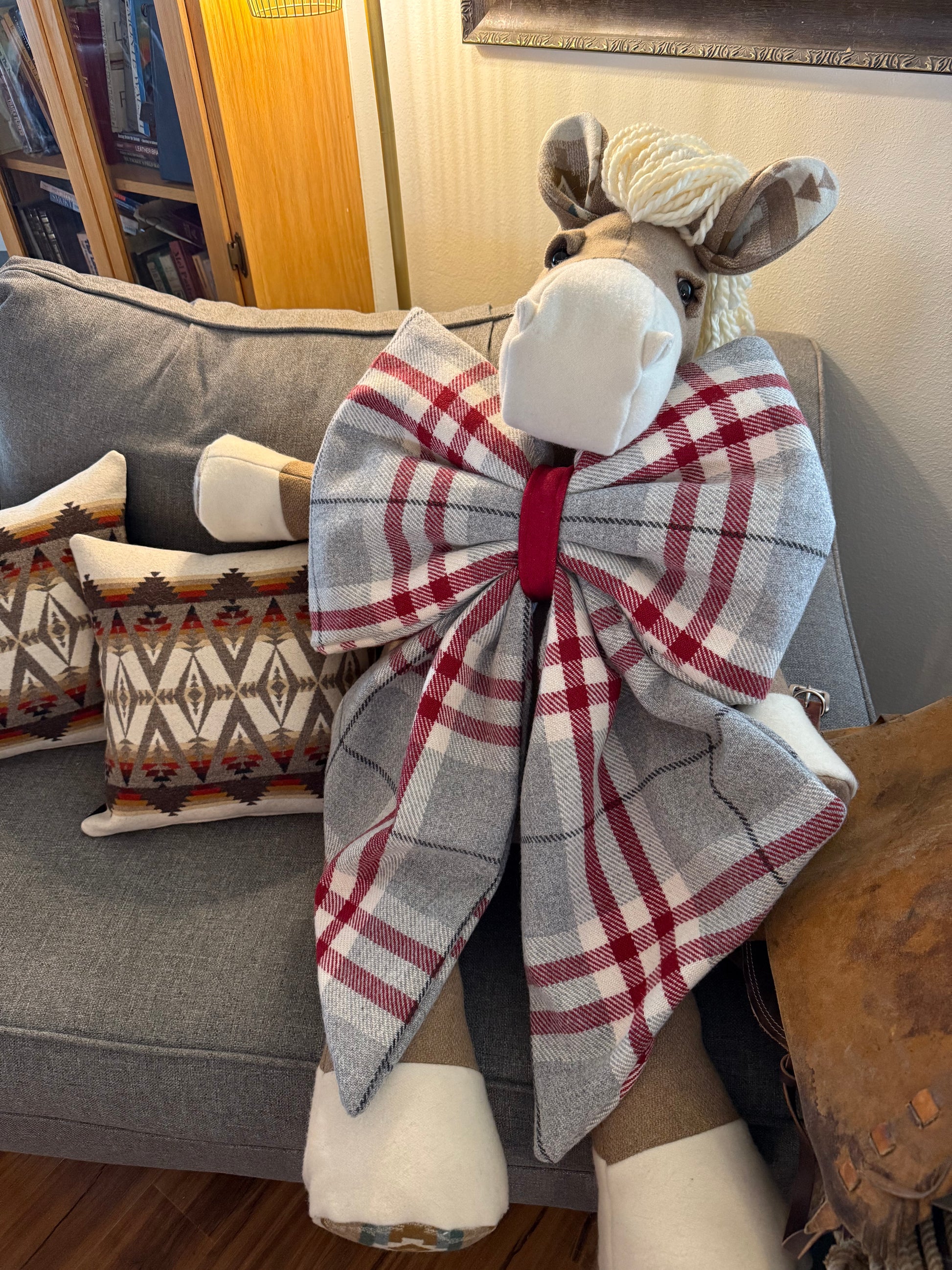 A large festive Christmas bow handmade with Pendleton® fabric. The bow is approximately 20 inches across and 30 inches top to bottom. A stretchy elastic can be added for your convenience, just send me a message with your order ☺️ to let me know.