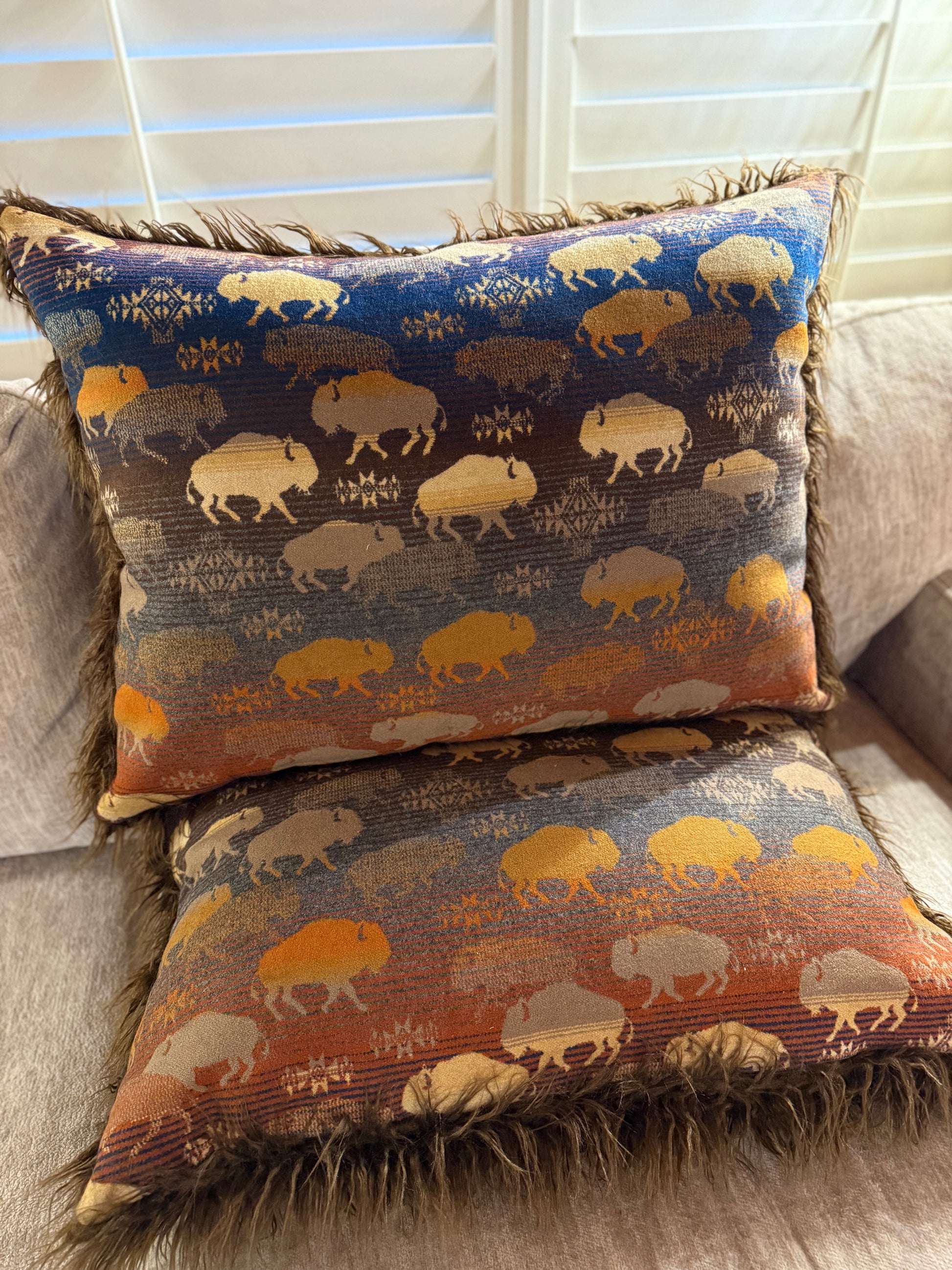 🚨One pillow left! 🚨It is made with 🦬 Land of Buffalo Pendleton® fabric and a brown faux fur. It is stuffed with a 25x32 down alternative insert and sports a YKK zipper. Price is per pillow.