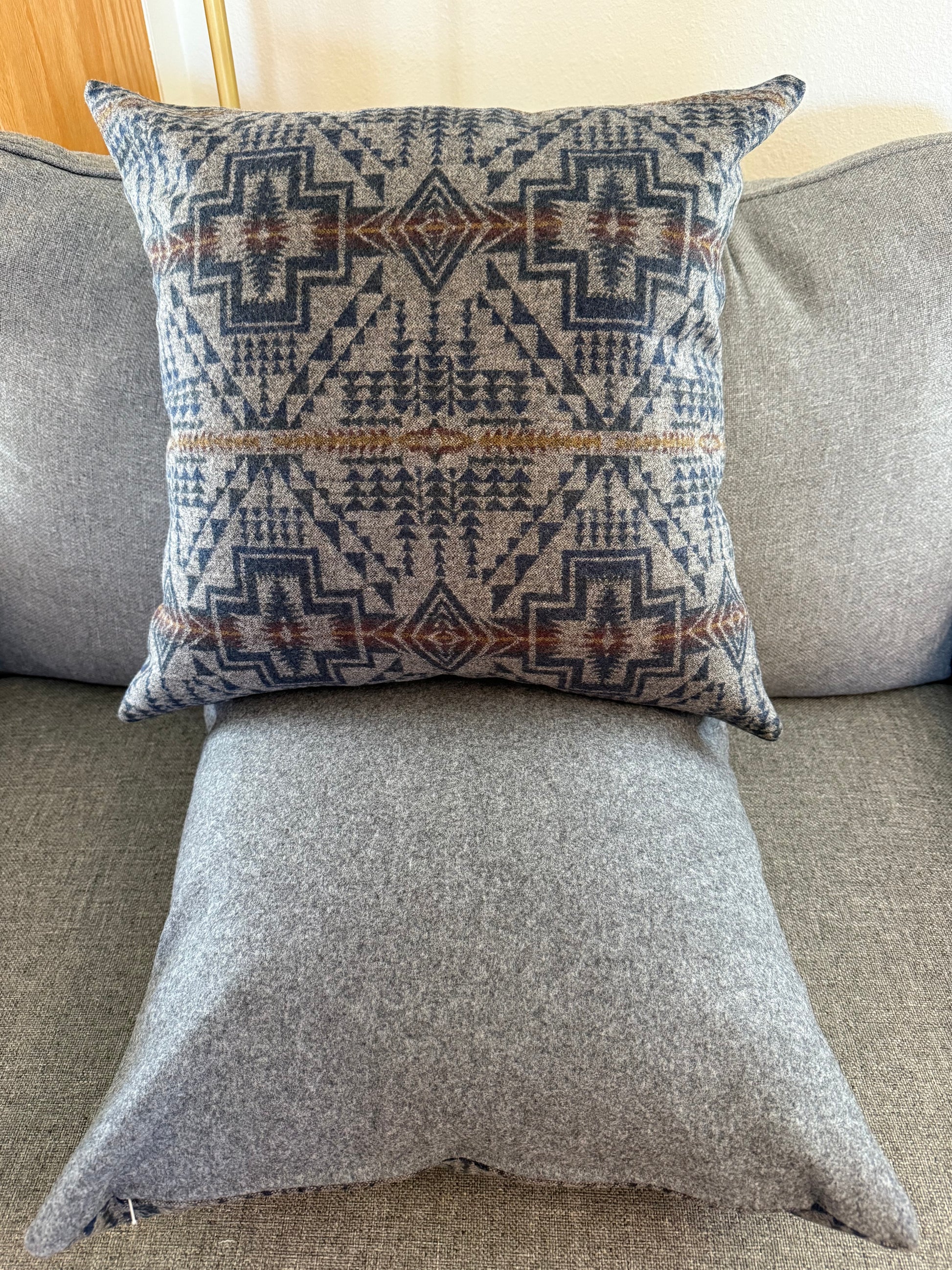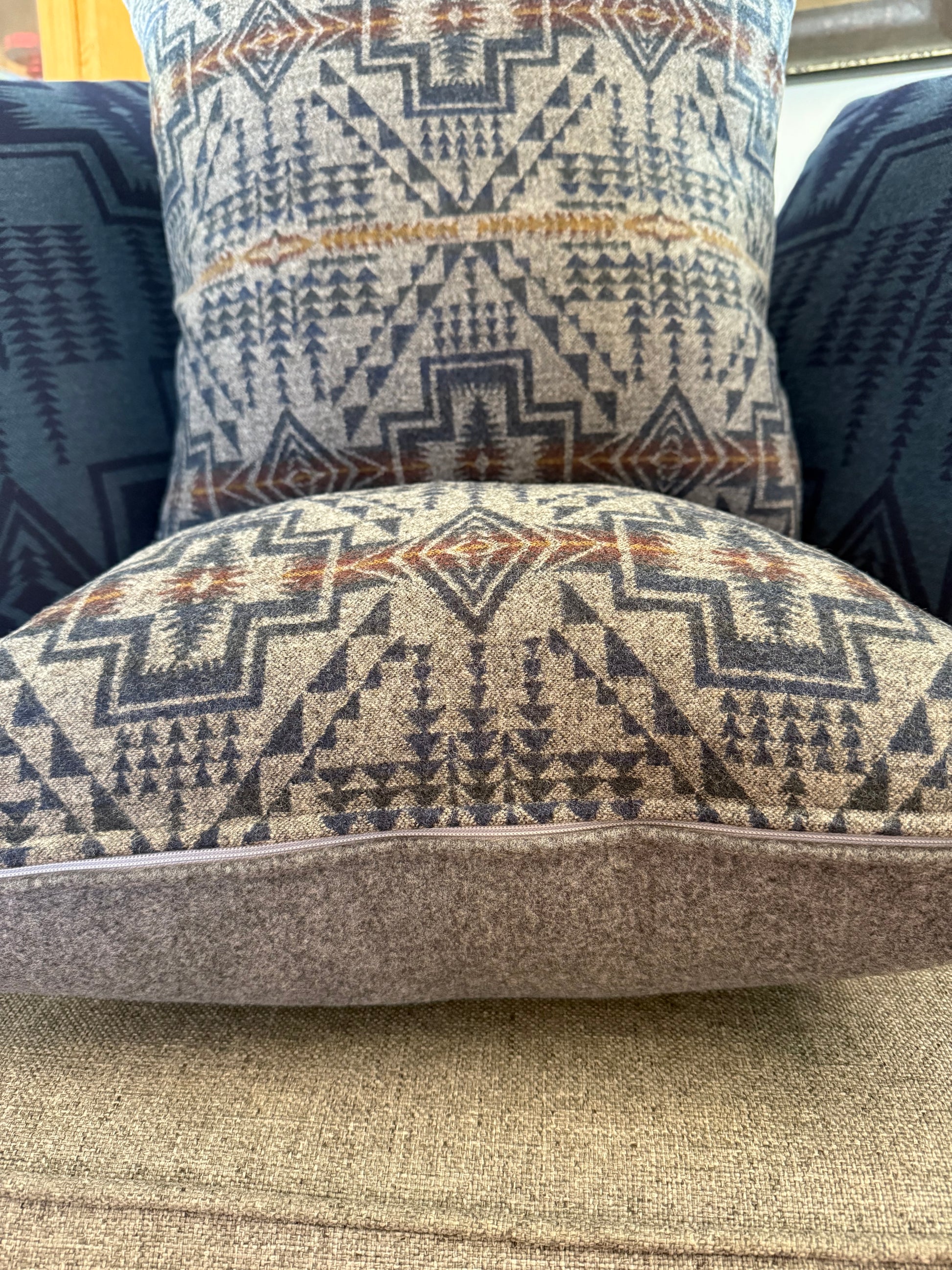 Cooler weather, cozy colors! Harding Trail Navy and Grey Eco-Wise Wool Pendleton® fabrics make for a perfect fall pillow. Six pillows available; each pillow has a YKK zipper and is stuffed with a fluffy 20x20 pillow insert. 6 available, pattern varies slightly on each pillow.