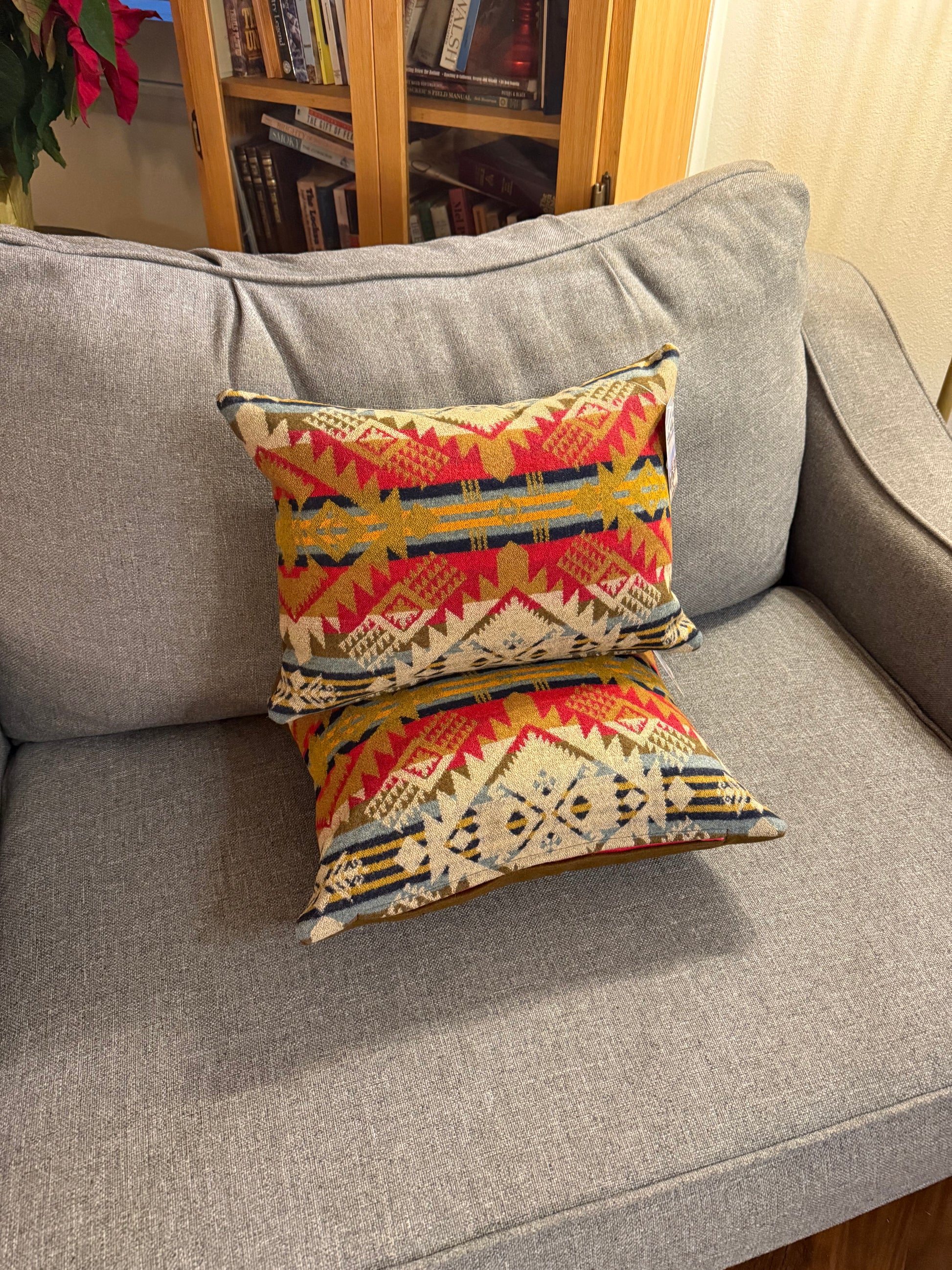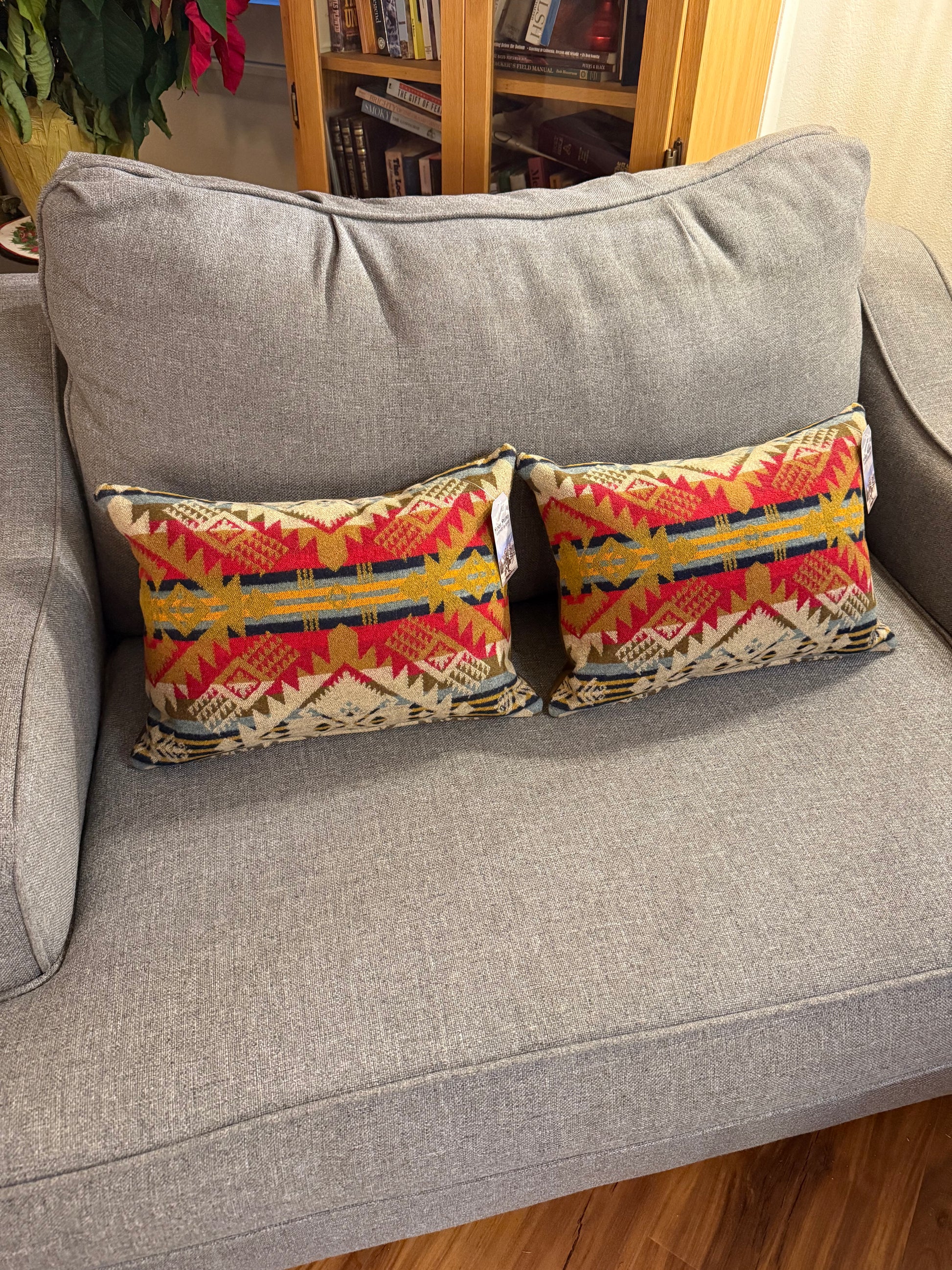 Two pillows made with Journey West and Olive Eco-Wise wool Pendleton® fabrics. Each pillow has a YKK zipper and is approximately 13x18 inches. Price is per pillow. Dry clean recommended.