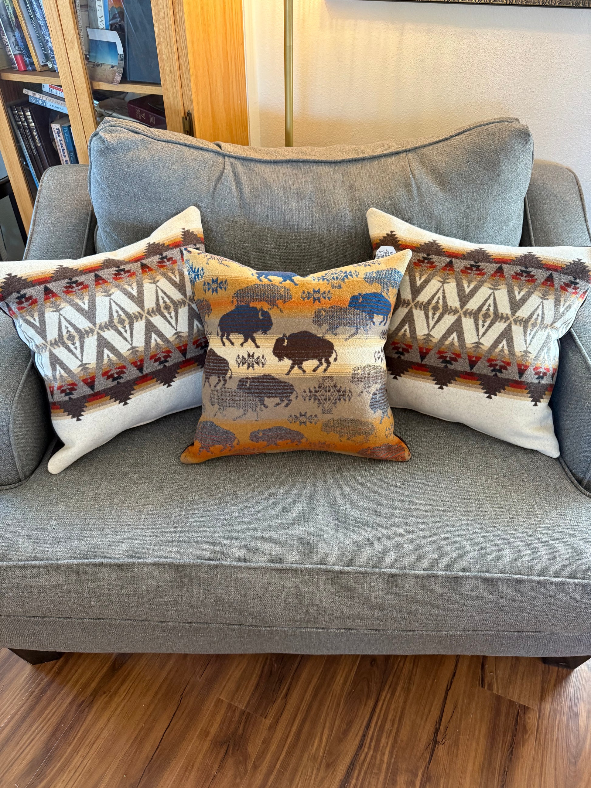 Accent pillow made with Land of Buffalo & Walnut Eco-Wise Pendleton® fabrics. YKK zipper and 20x20 pillow insert.