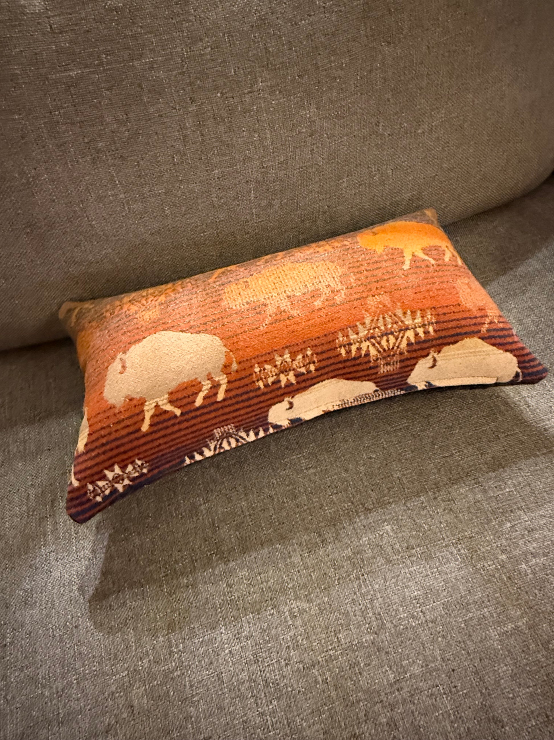 A 10x18 lumbar pillow made with 🦬 Land of Buffalo and Charcoal Pendleton® fabrics. Navy zipper.