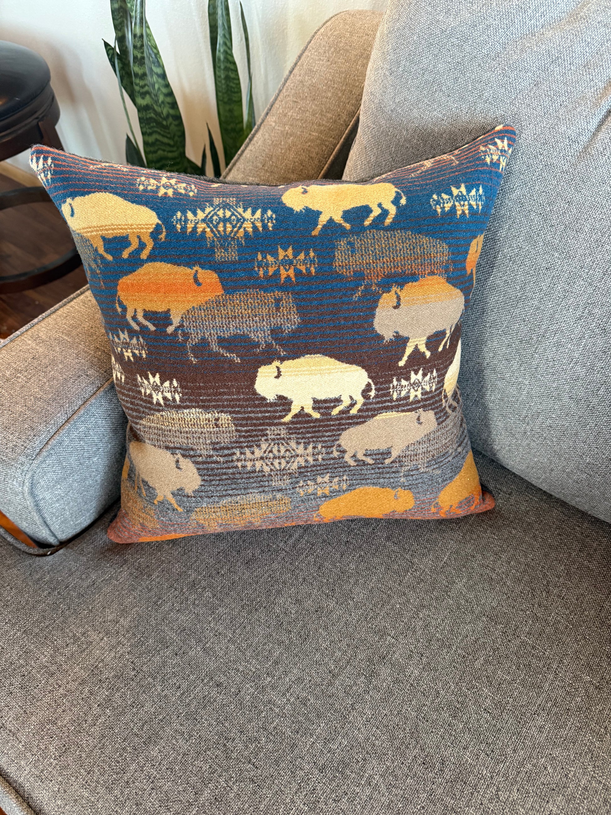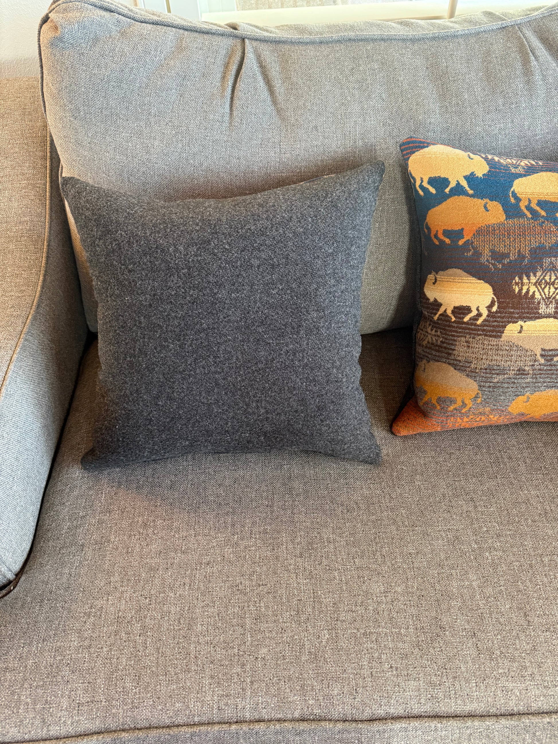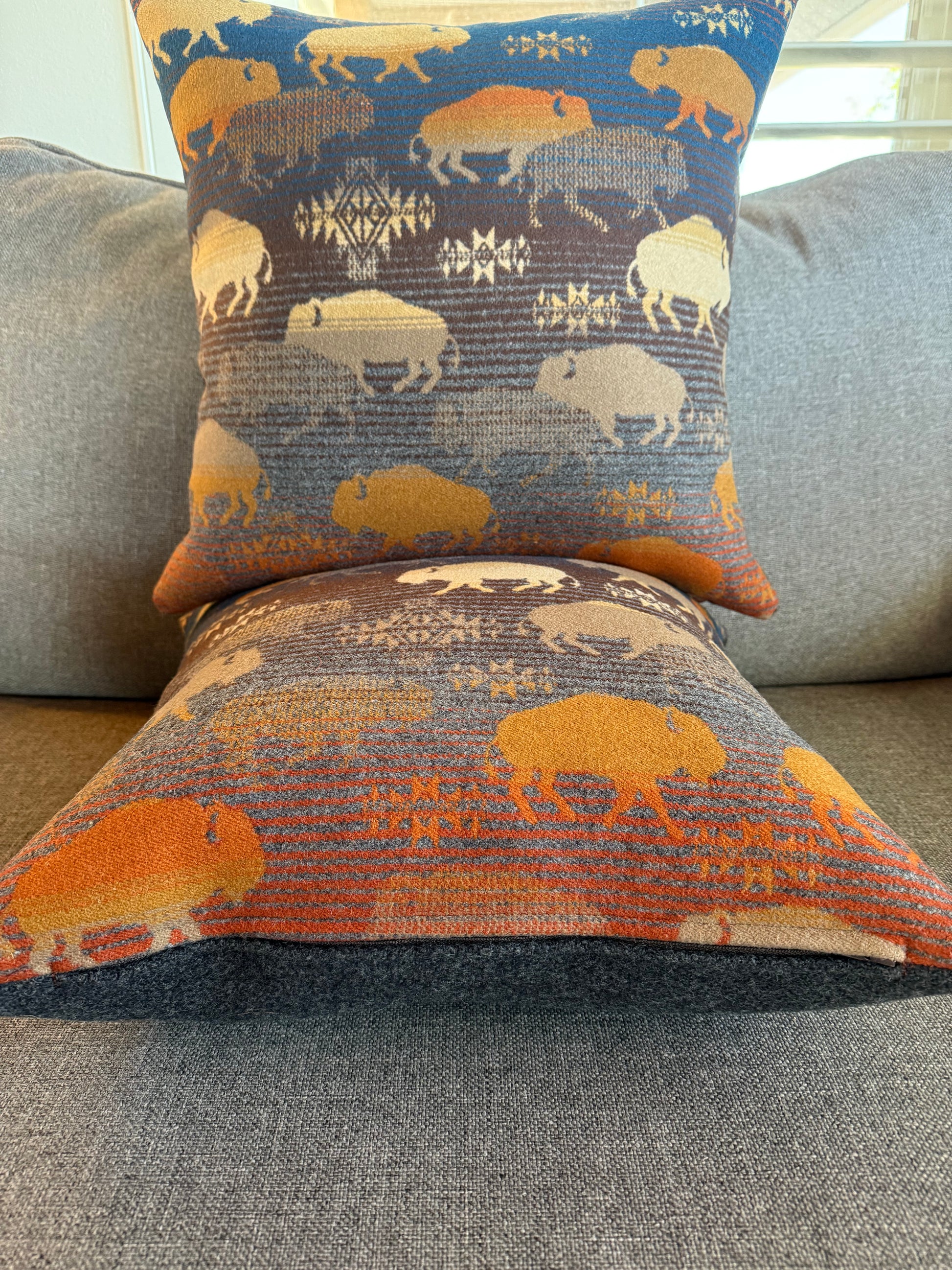 This set of two pillows is made with 🦬 Land of Buffalo and Charcoal Gray Pendleton® fabrics. Each pillow is stuffed with a 20x20 cluster poly insert and sports a YKK zipper.