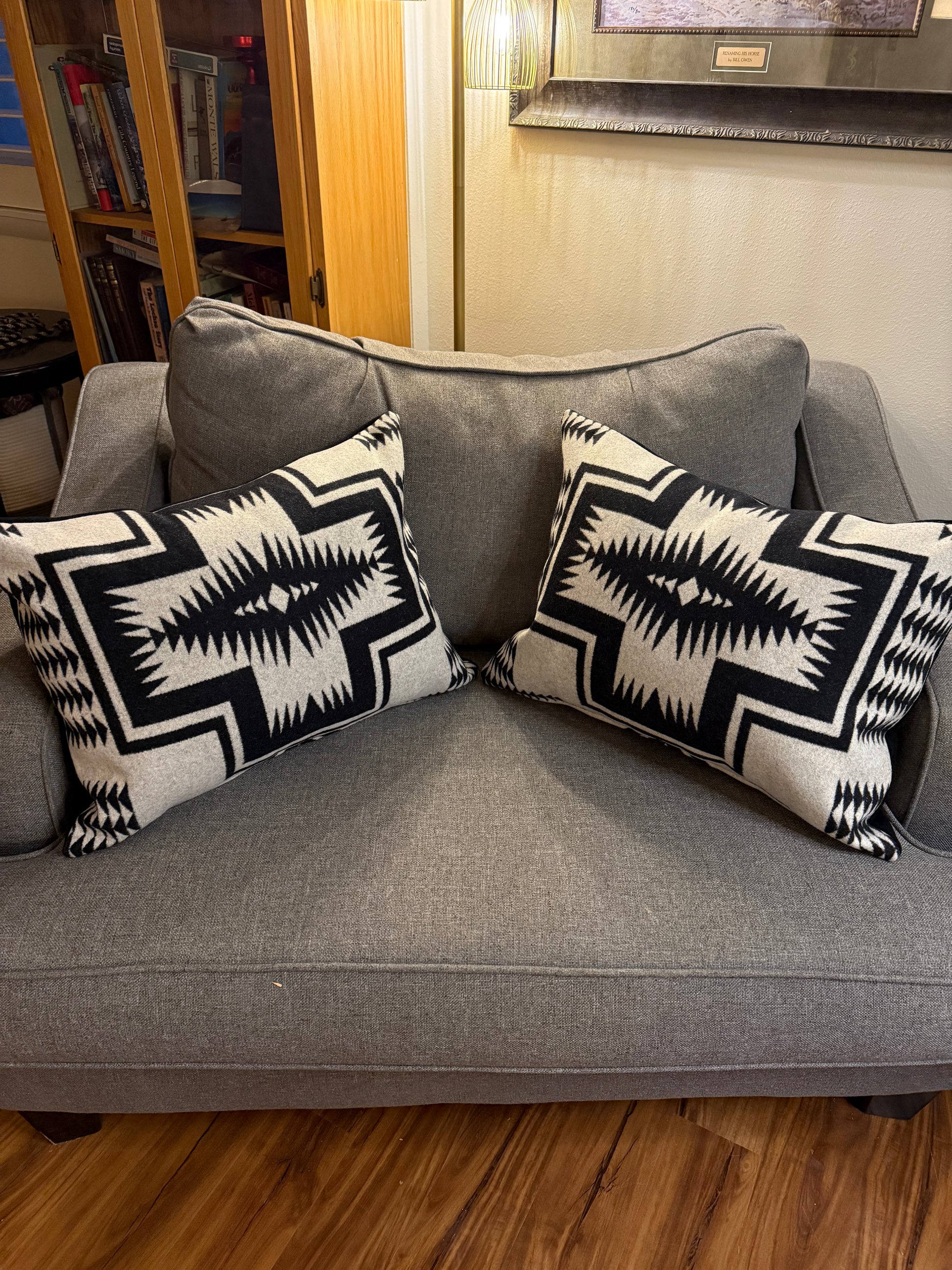 Set of two large pillows made with Walking Rock and Black Eco-Wise Wool Pendleton® fabrics. Pillows finished out to be about 23.5x19.5. Each pillow has a YKK zipper, and is stuffed with a 24x24 pillow insert. Dry clean recommended.
