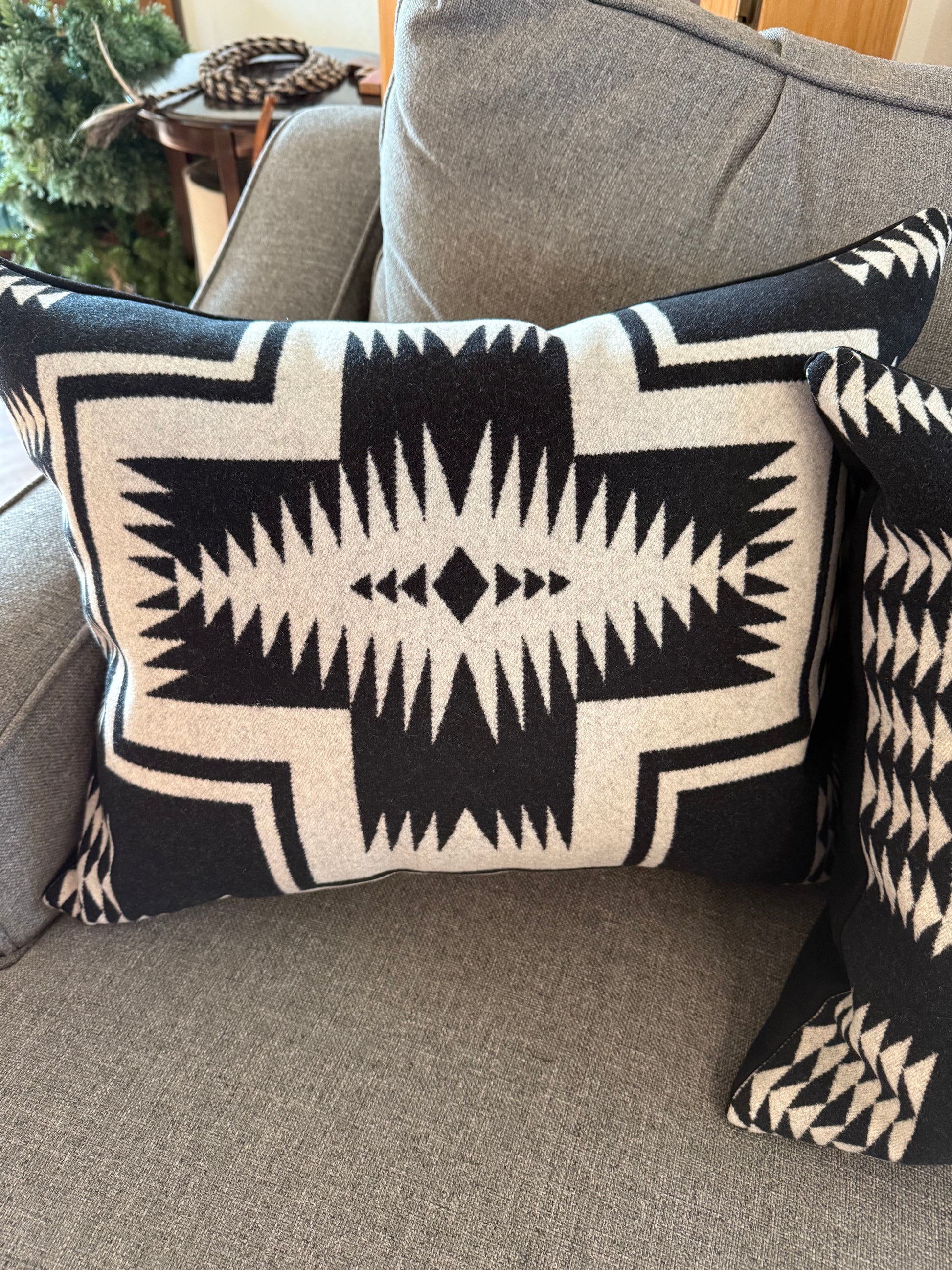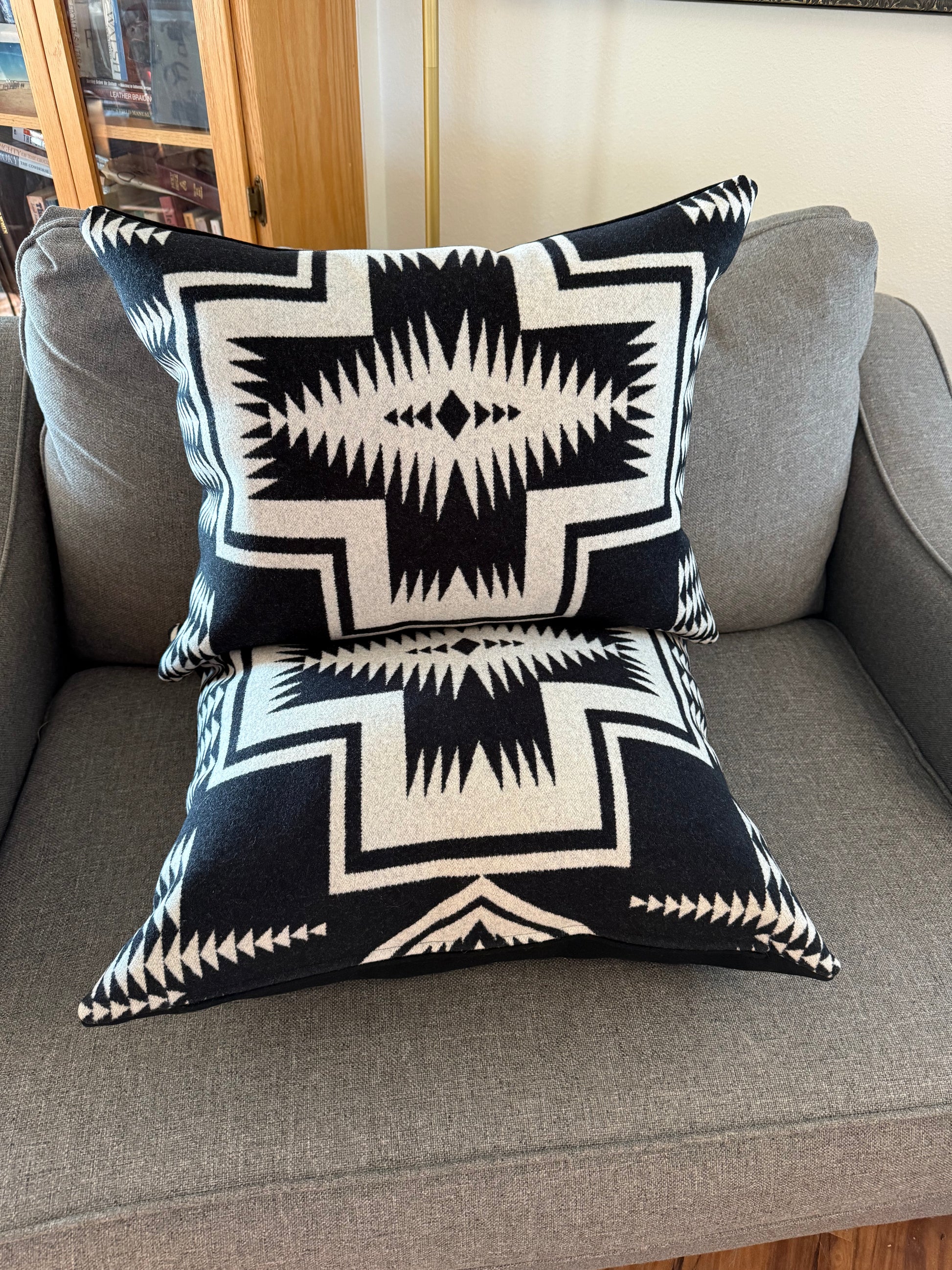 Large pillows made with Walking Rock and Black Melton Pendleton® fabrics. Pillows covers finished out to be about 23.5x19.5. Each pillow has a YKK zipper, and is stuffed with a 24x24 pillow insert. Price is per pillow. Dry clean recommended.