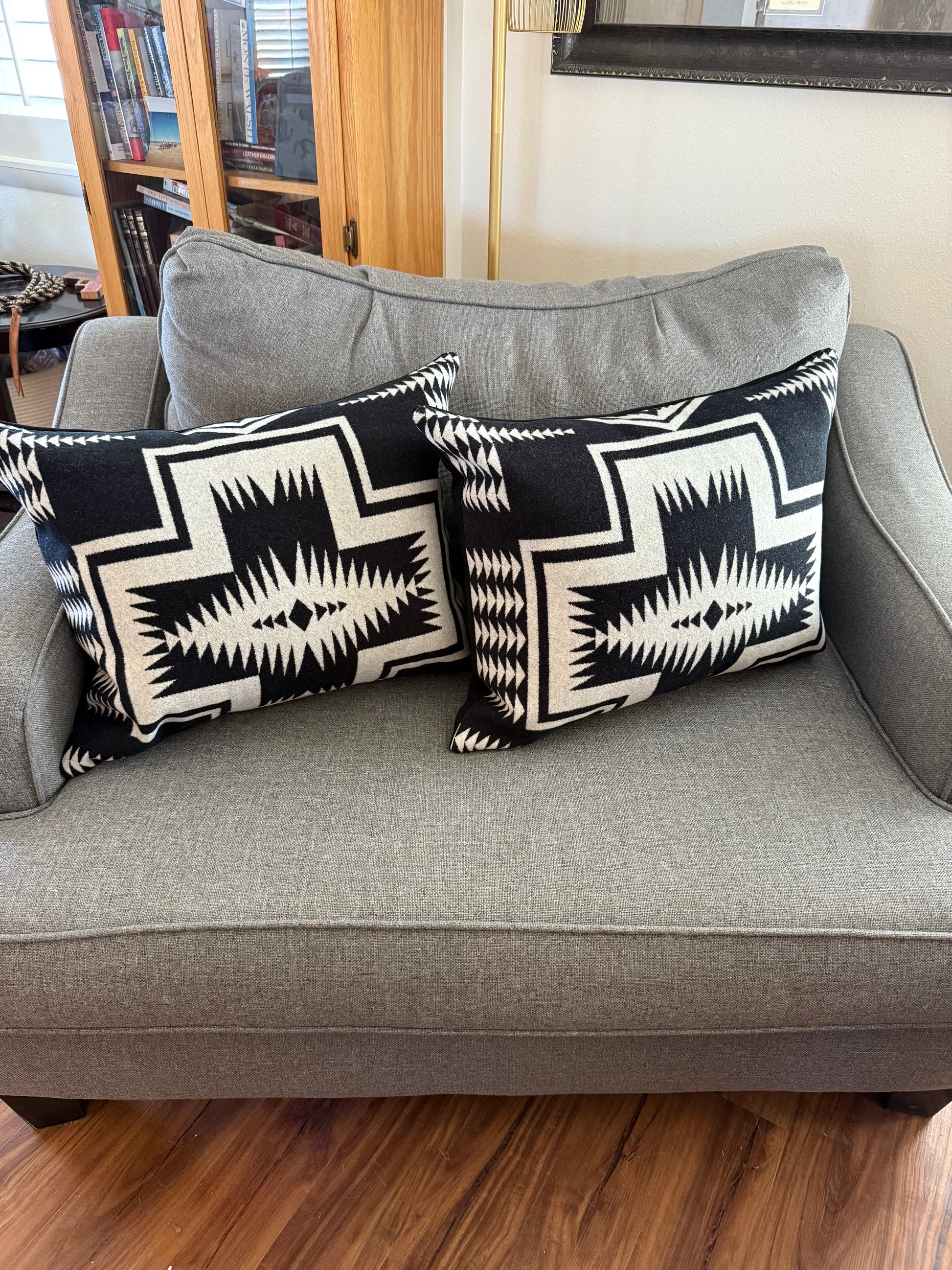 Large pillows made with Walking Rock and Black Melton Pendleton® fabrics. Pillows covers finished out to be about 23.5x19.5. Each pillow has a YKK zipper, and is stuffed with a 24x24 pillow insert. Price is per pillow. Dry clean recommended.