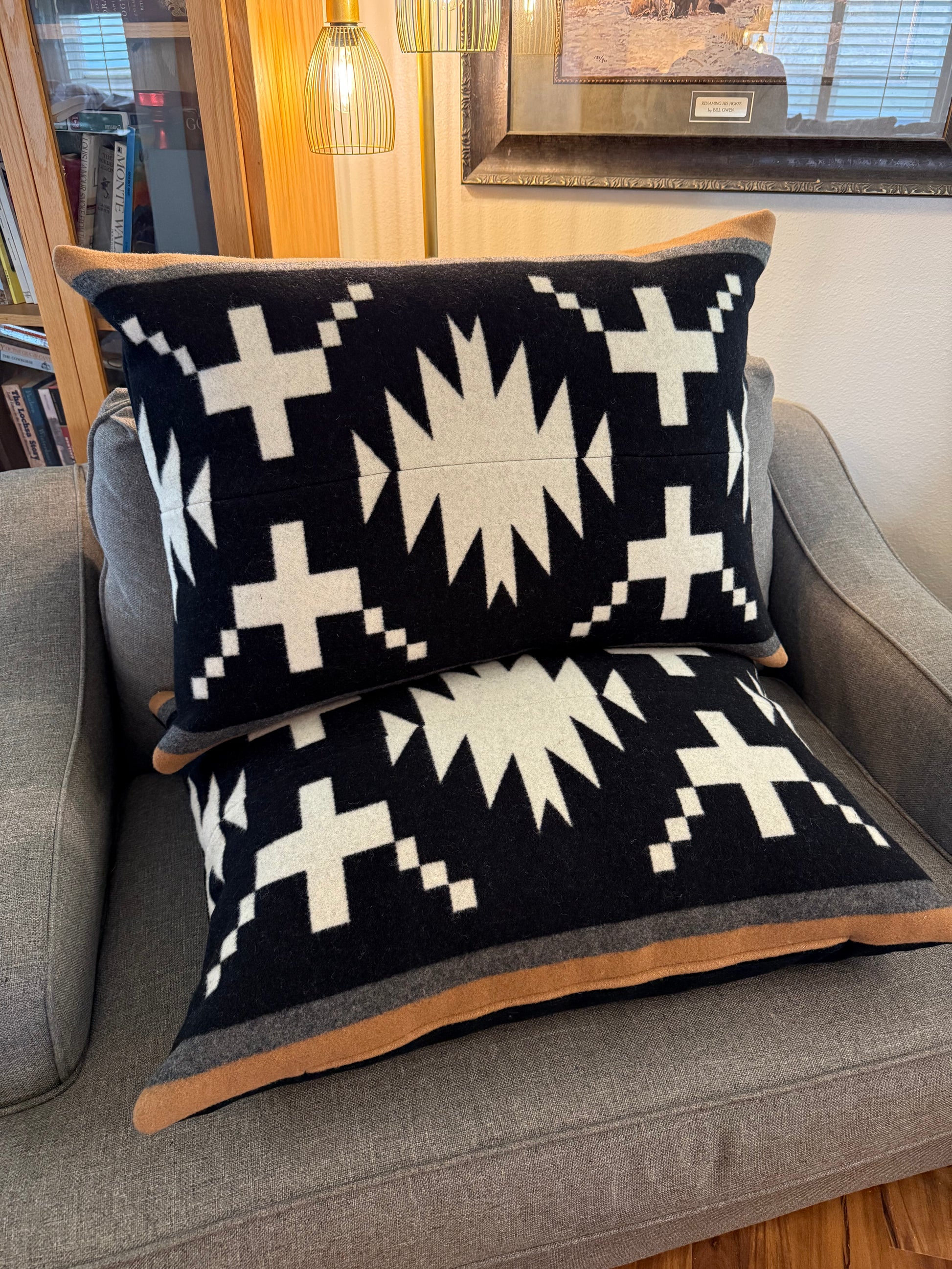 🚨 Limited! 🚨 Custom designed, extra-large pillows handmade with Spider Rock and Black Eco-Wise Wool Pendleton® fabrics. Each pillow has a YKK zipper and is stuffed with a 25x32 down alternative pillow insert.