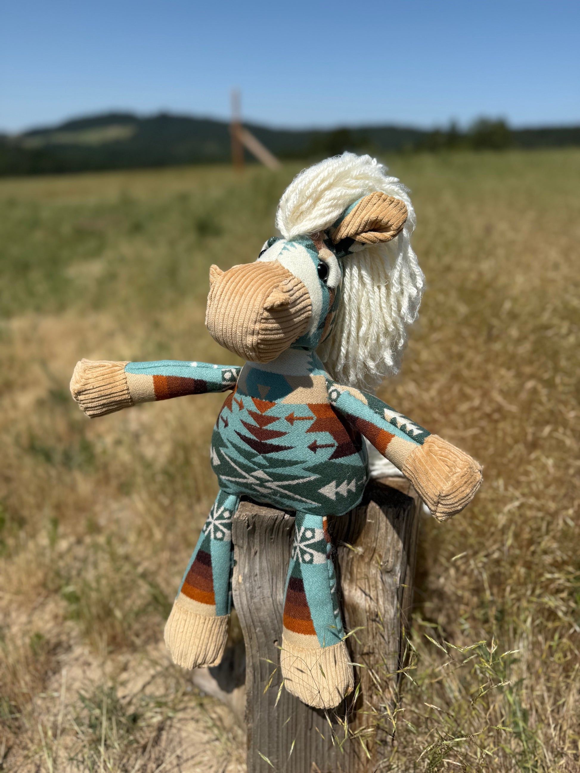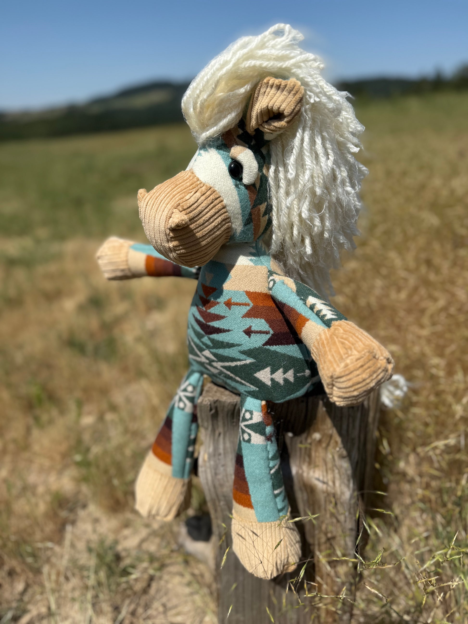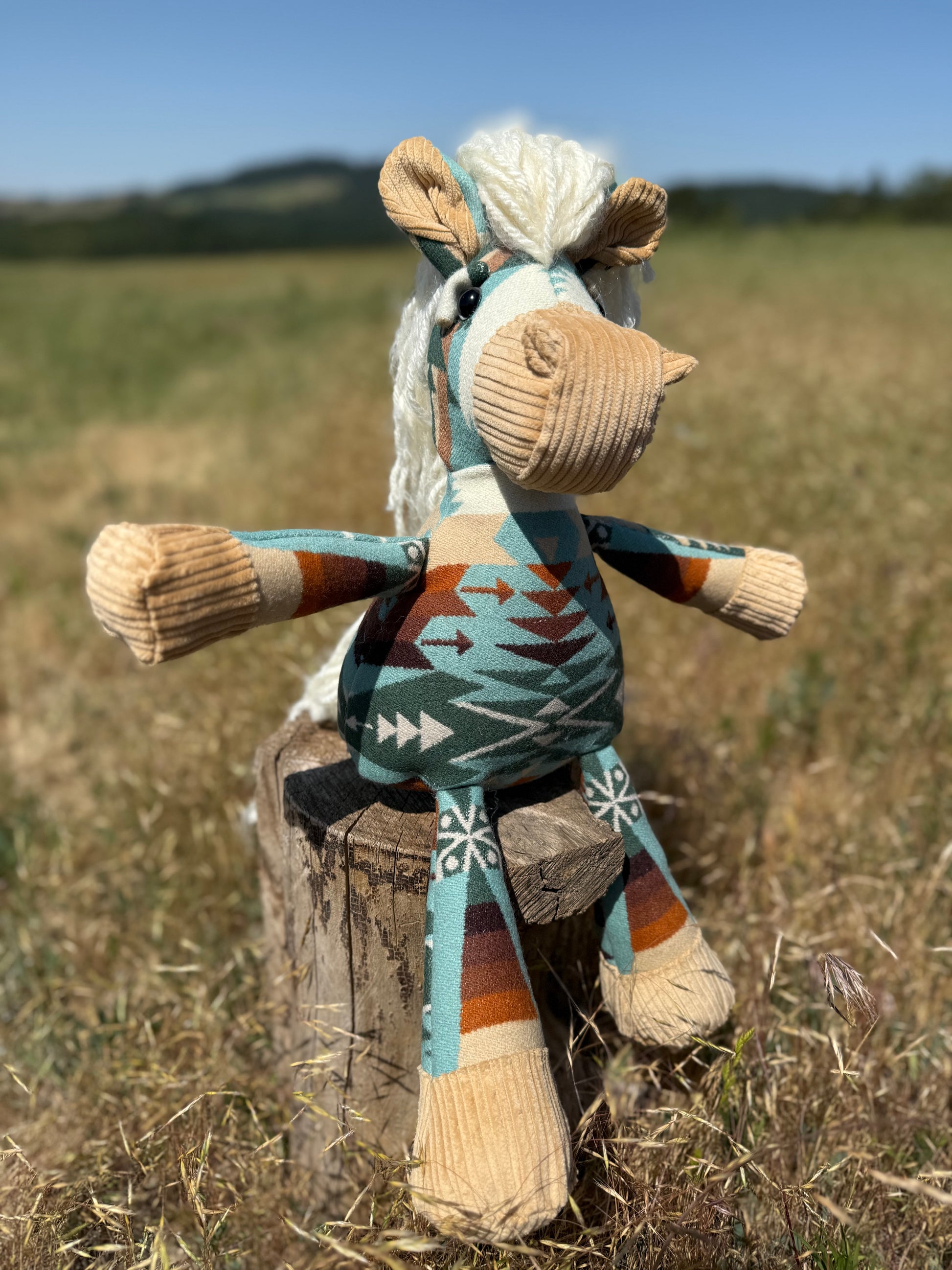 This heirloom quality horse has been carefully crafted, stitch-by-stitch, using Pendleton® fabrics and hand- selected accents. This horse sits about 3 hands high (approx. 12 inches).