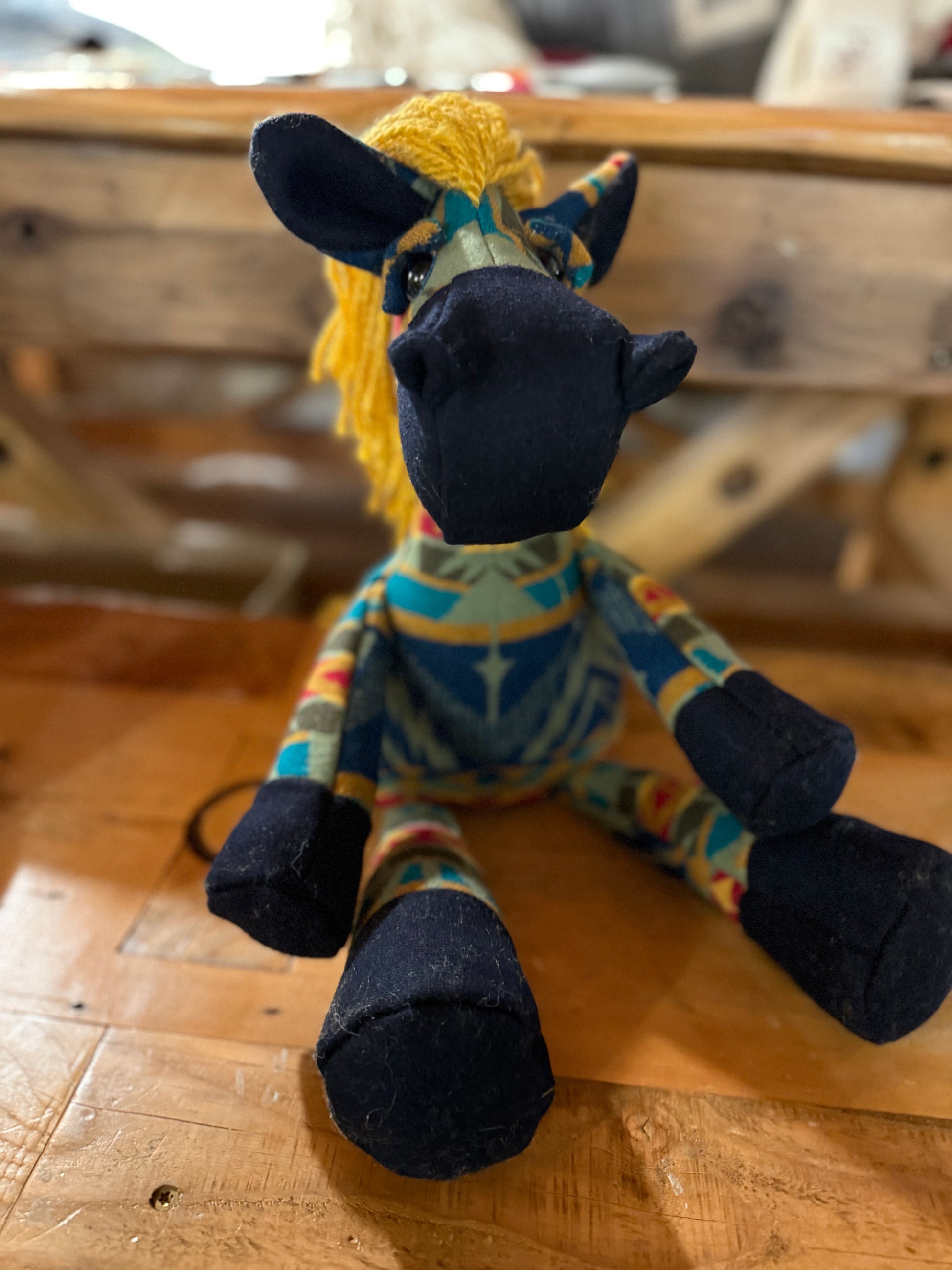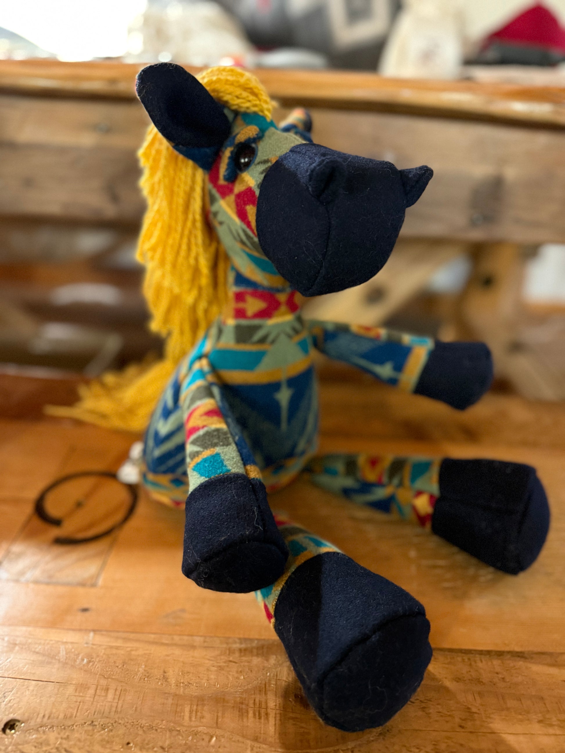 This heirloom quality horse has been carefully crafted, stitch-by-stitch, using Pendleton® fabrics and hand- selected accents. This horse sits about 3 hands high (approx. 12 inches).