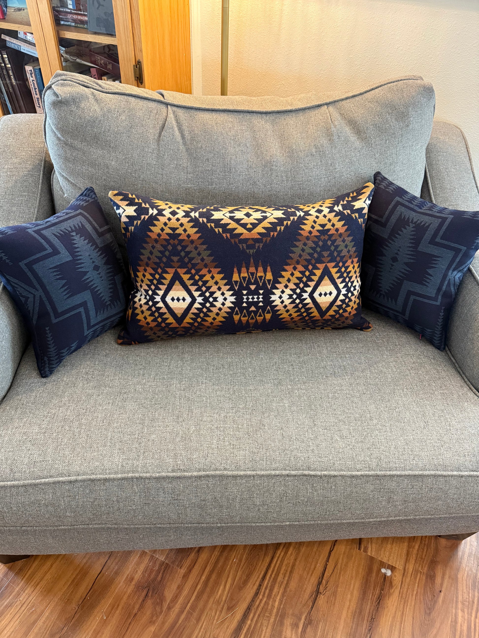 Small set of two pillows made with Harding Indigo Sunbrella and Navy Melton Pendleton® fabrics. Stuffed with 16x16 pillow inserts.