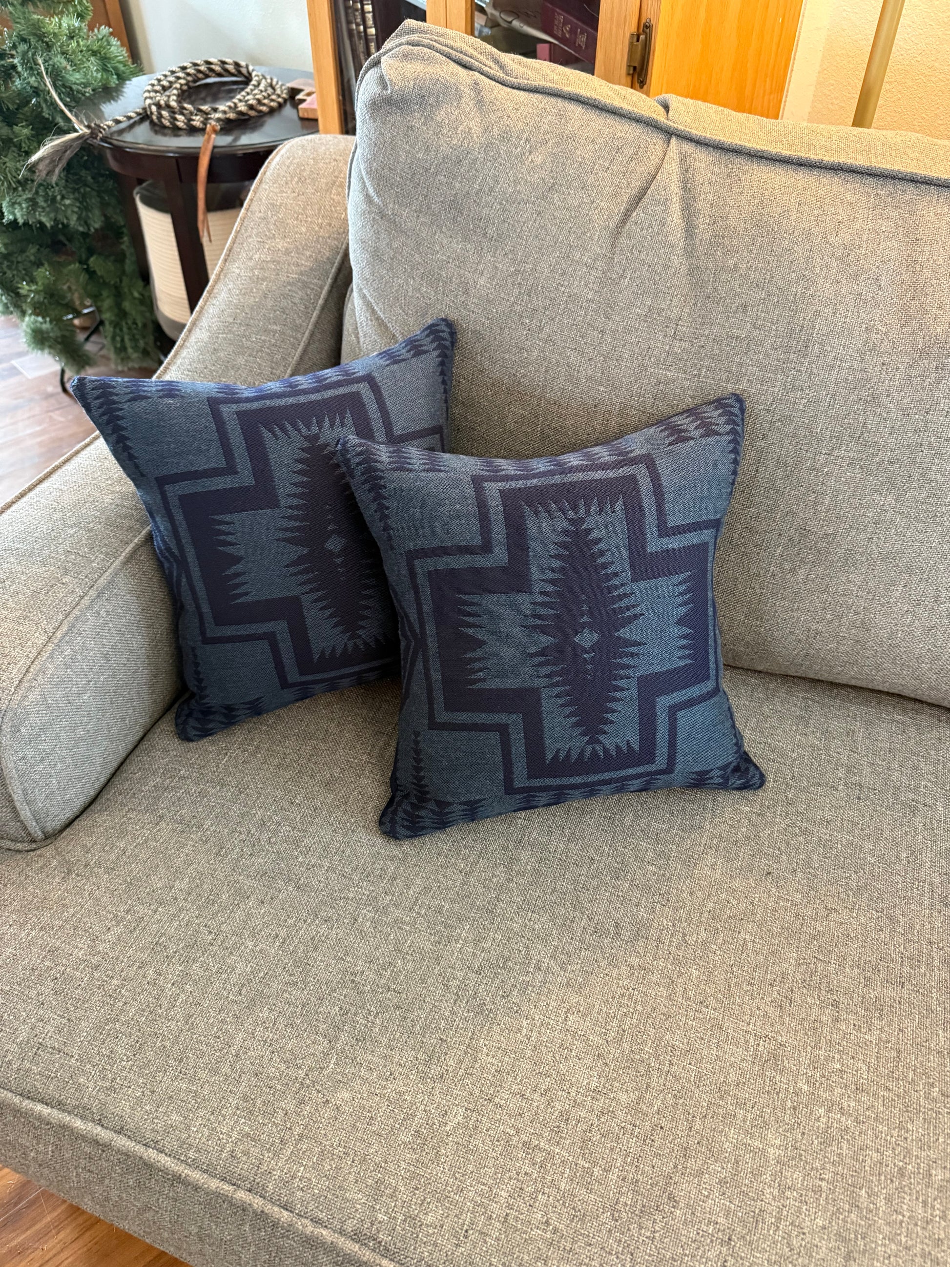 Small set of two pillows made with Harding Indigo Sunbrella and Navy Melton Pendleton® fabrics. Stuffed with 16x16 pillow inserts.