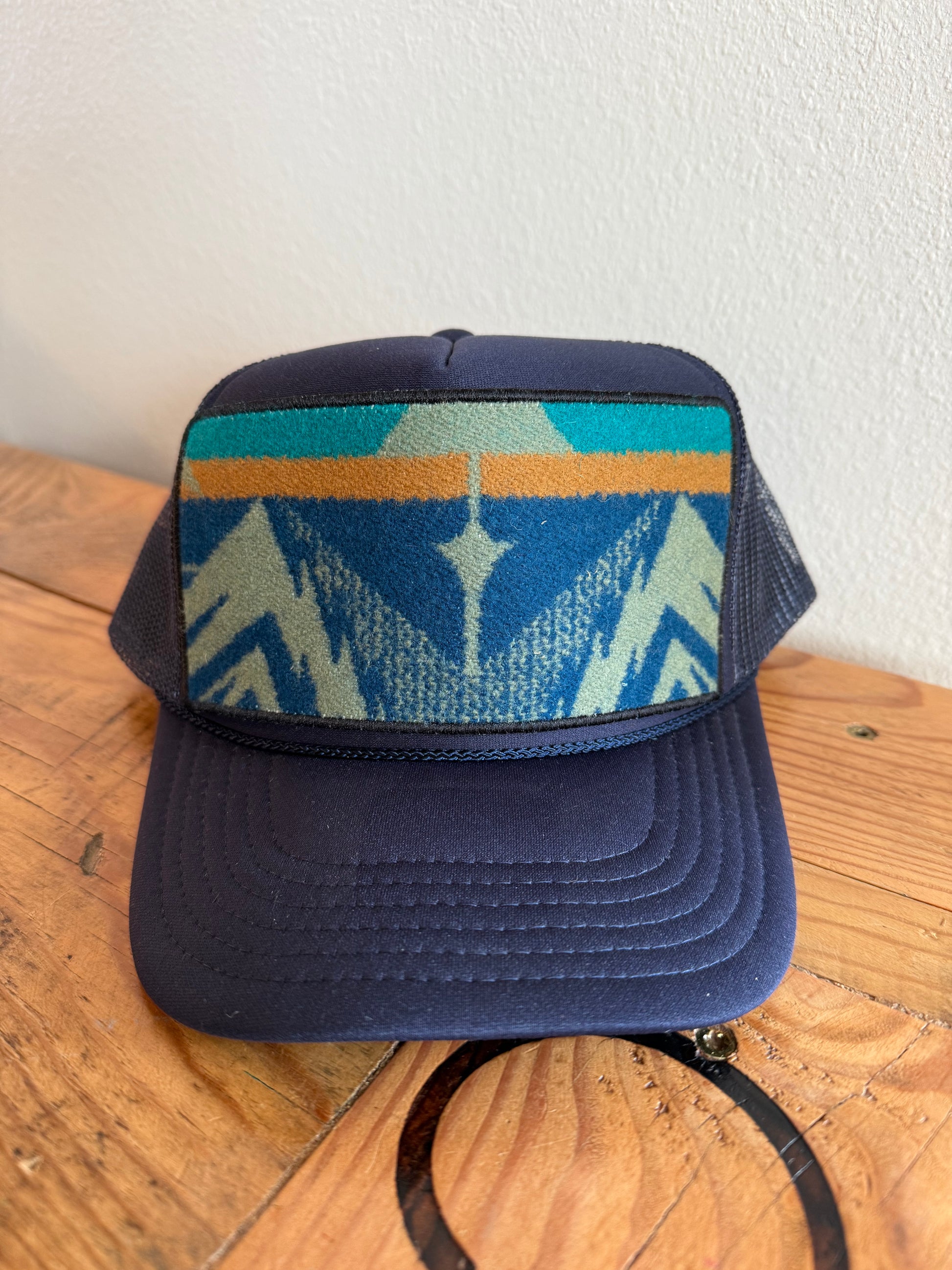 Navy trucker hat with Pendleton® fabric.