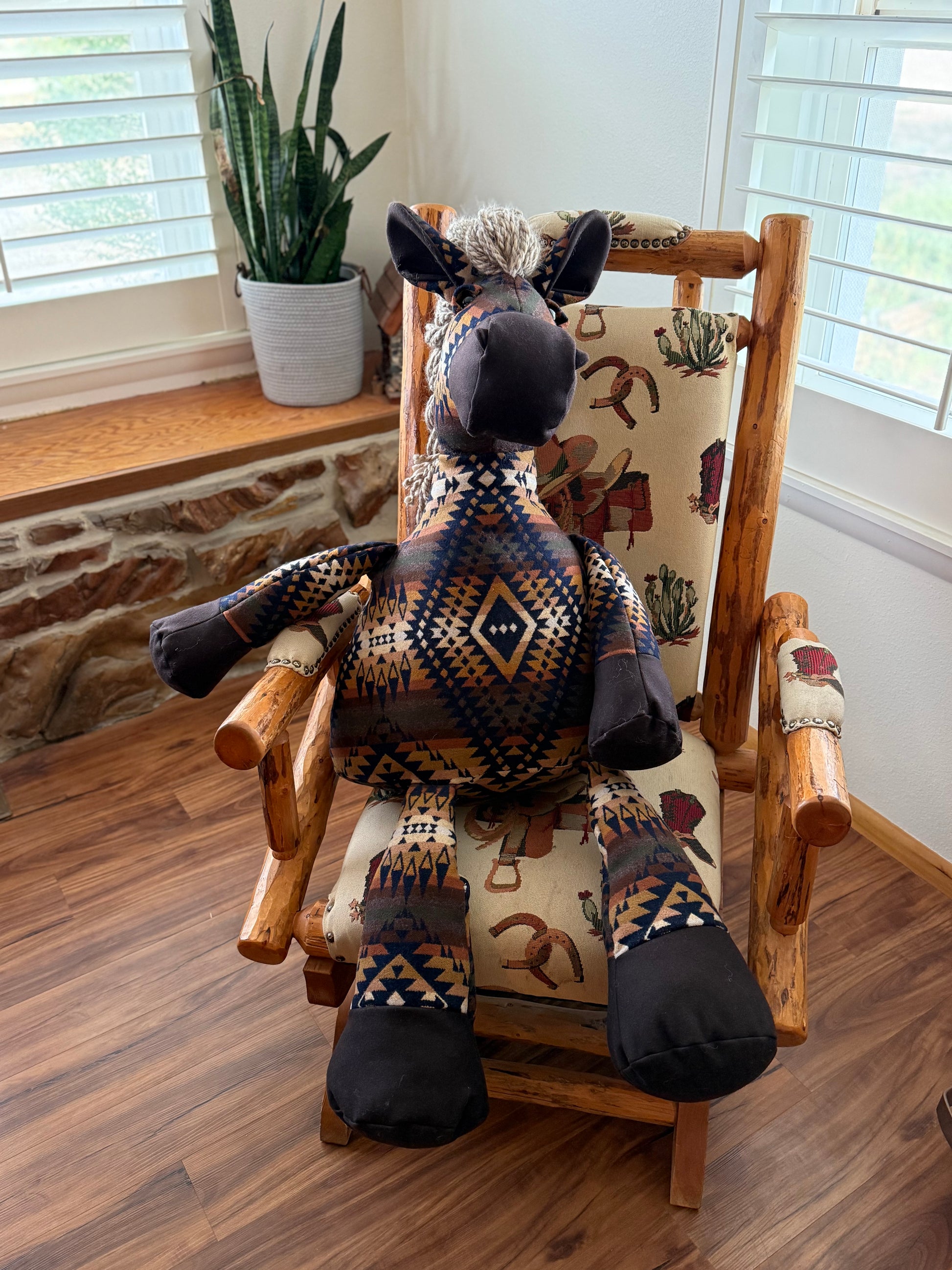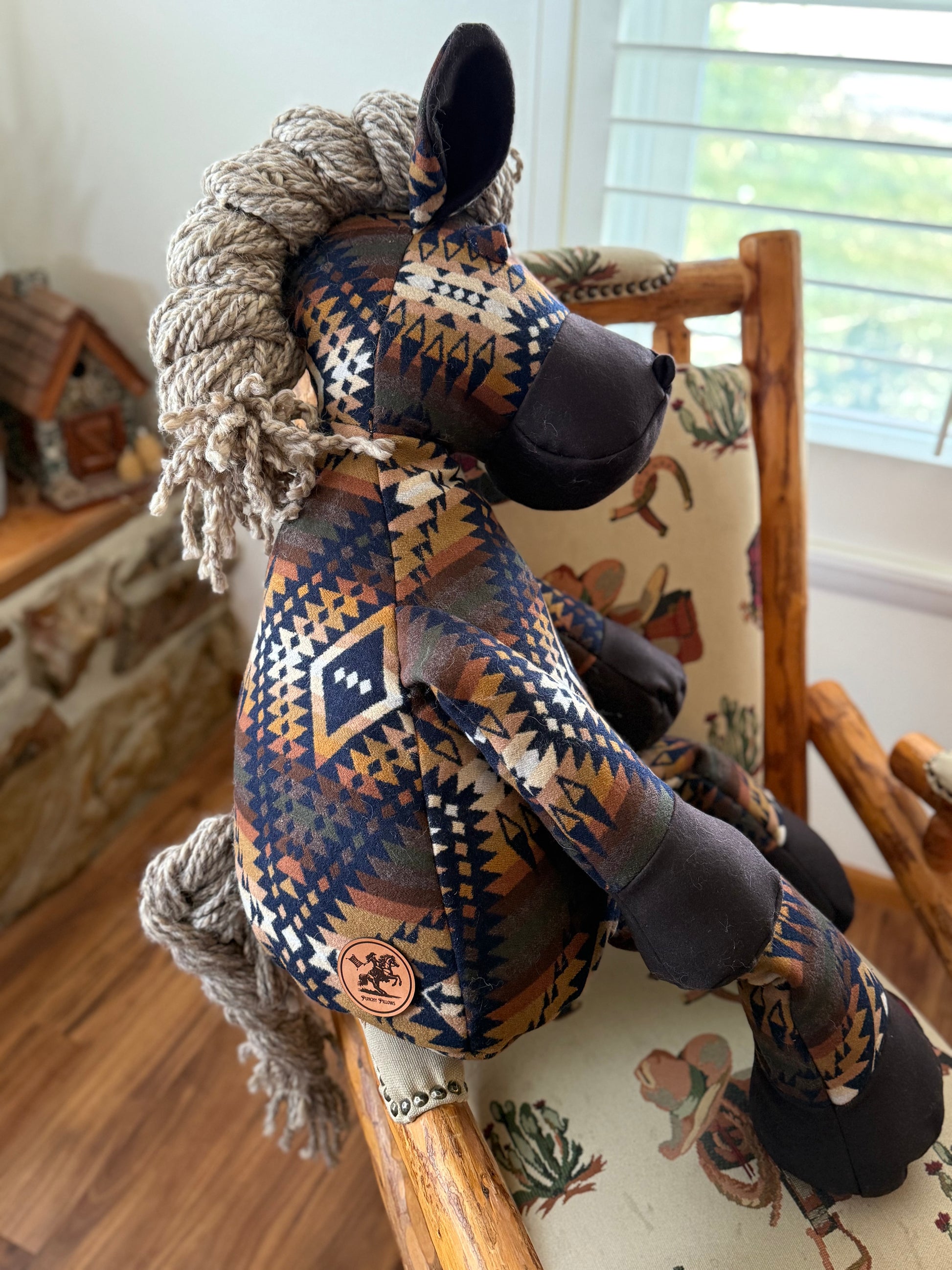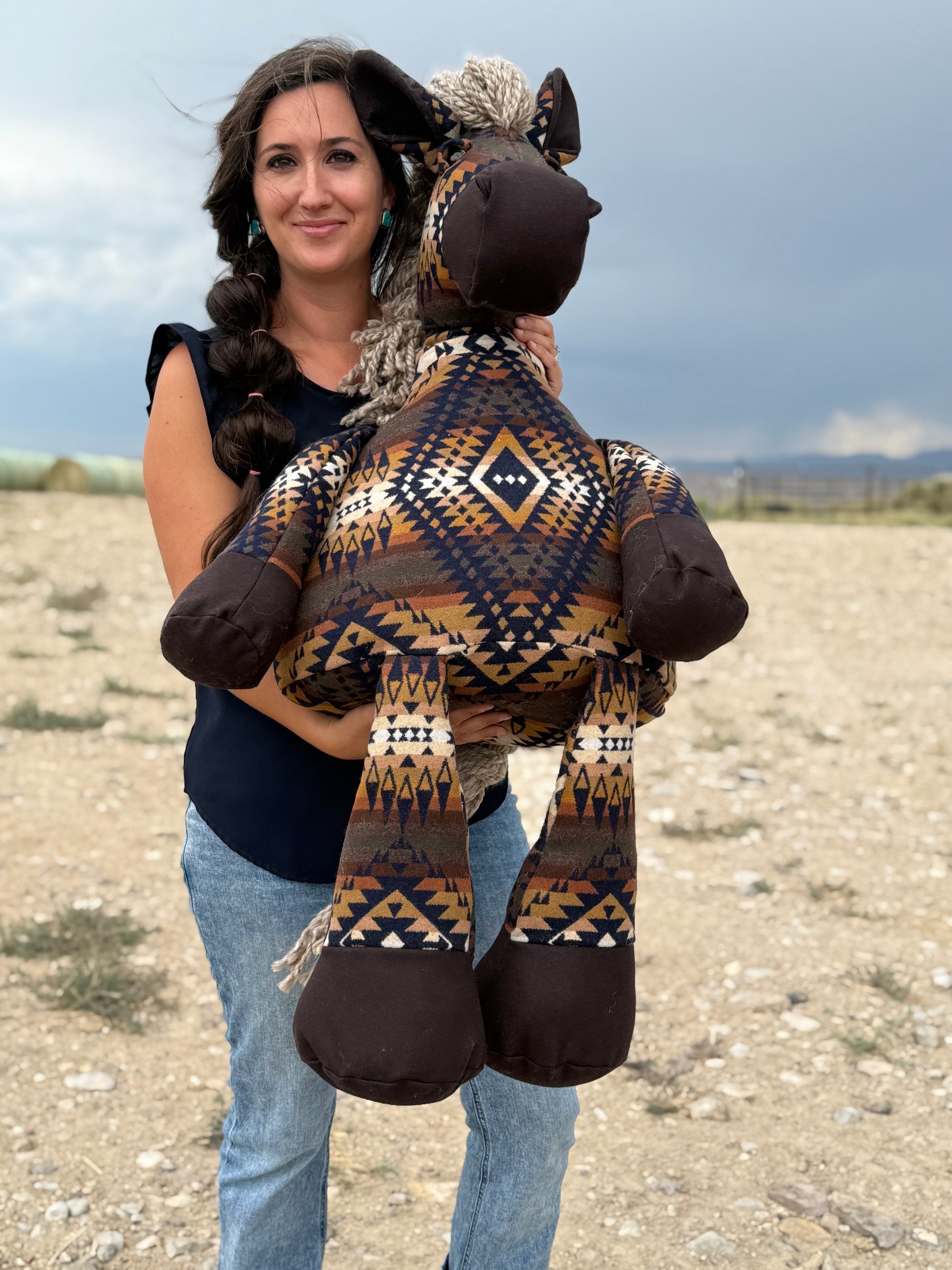 This massive, heirloom quality horse has been carefully crafted, stitch-by-stitch, using Mission Trails Navy and Walnut Eco-Wise Wool Pendleton® fabrics. This horse sits about 6.1 hands high (approx. 25 inches).