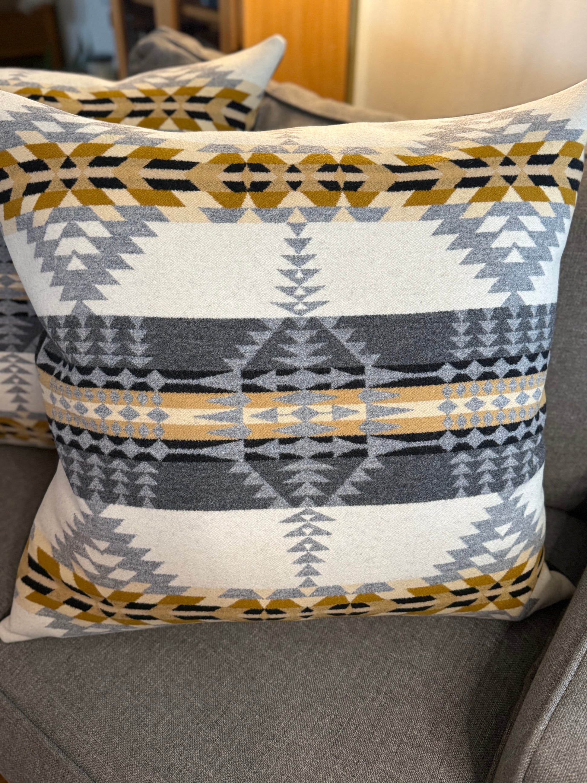 Extra large pillows made with Rancho Arroyo Silver and Dark Gray Pendleton® fabrics. Each pillow has a YKK zipper and is stuffed with 28x28 pillow inserts. Price is per pillow.