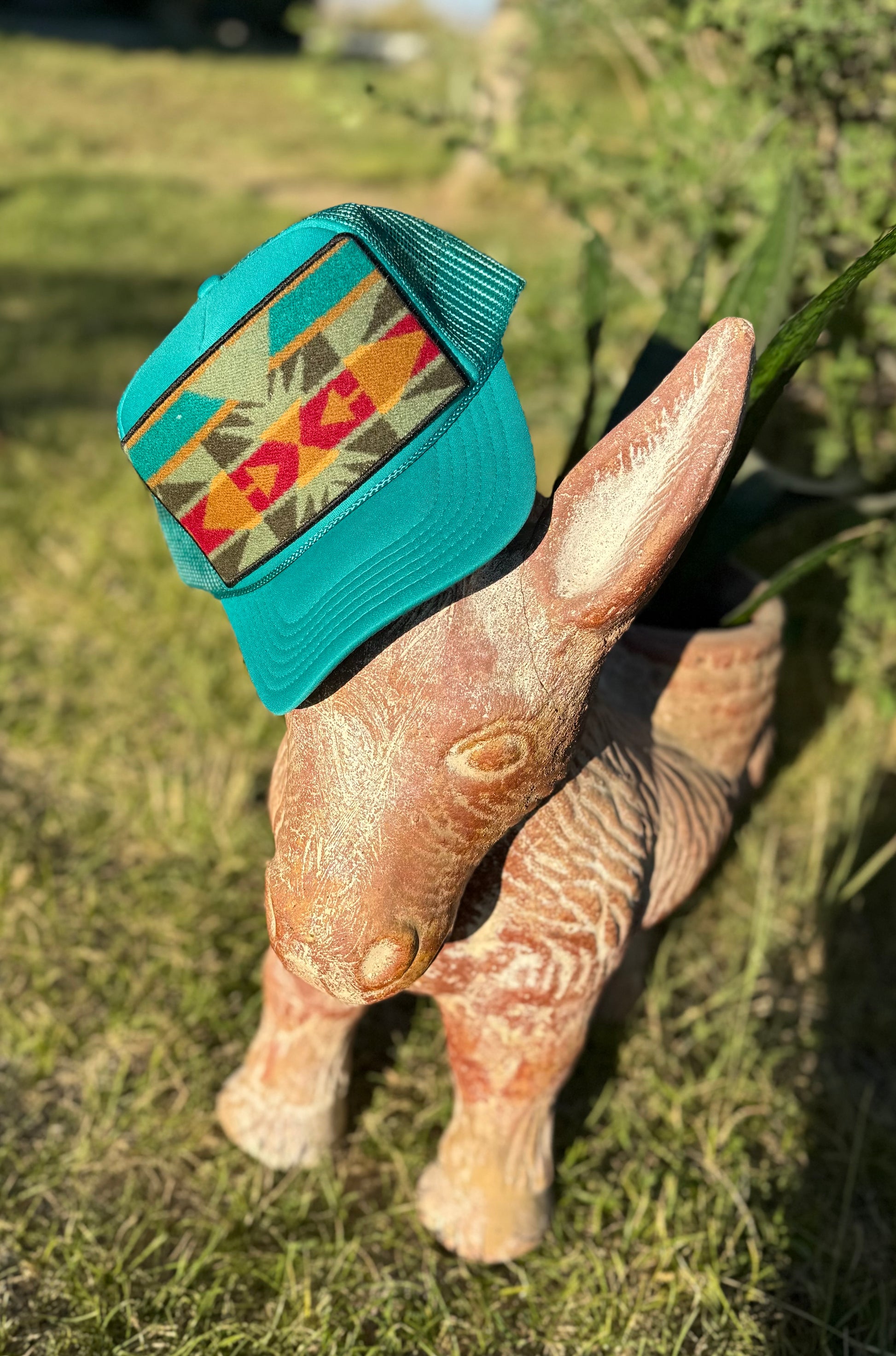 Seafoam green trucker hat with Pendleton® fabric patch & embroidered edge.