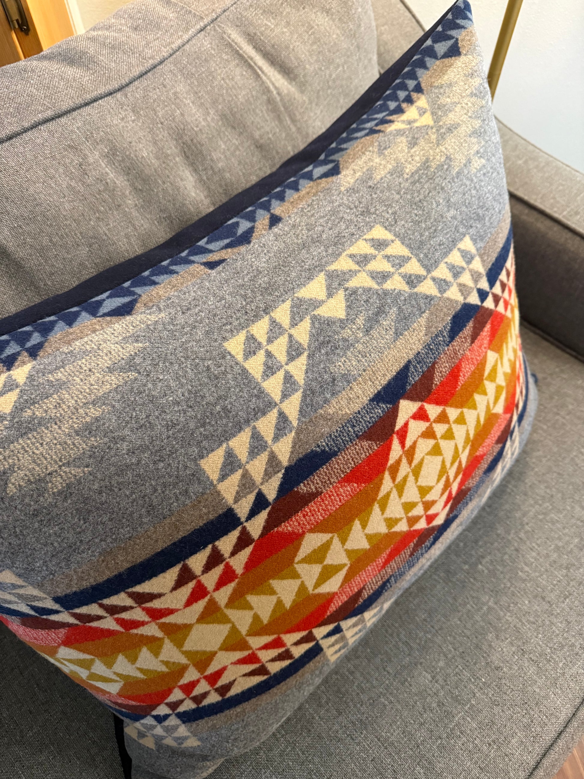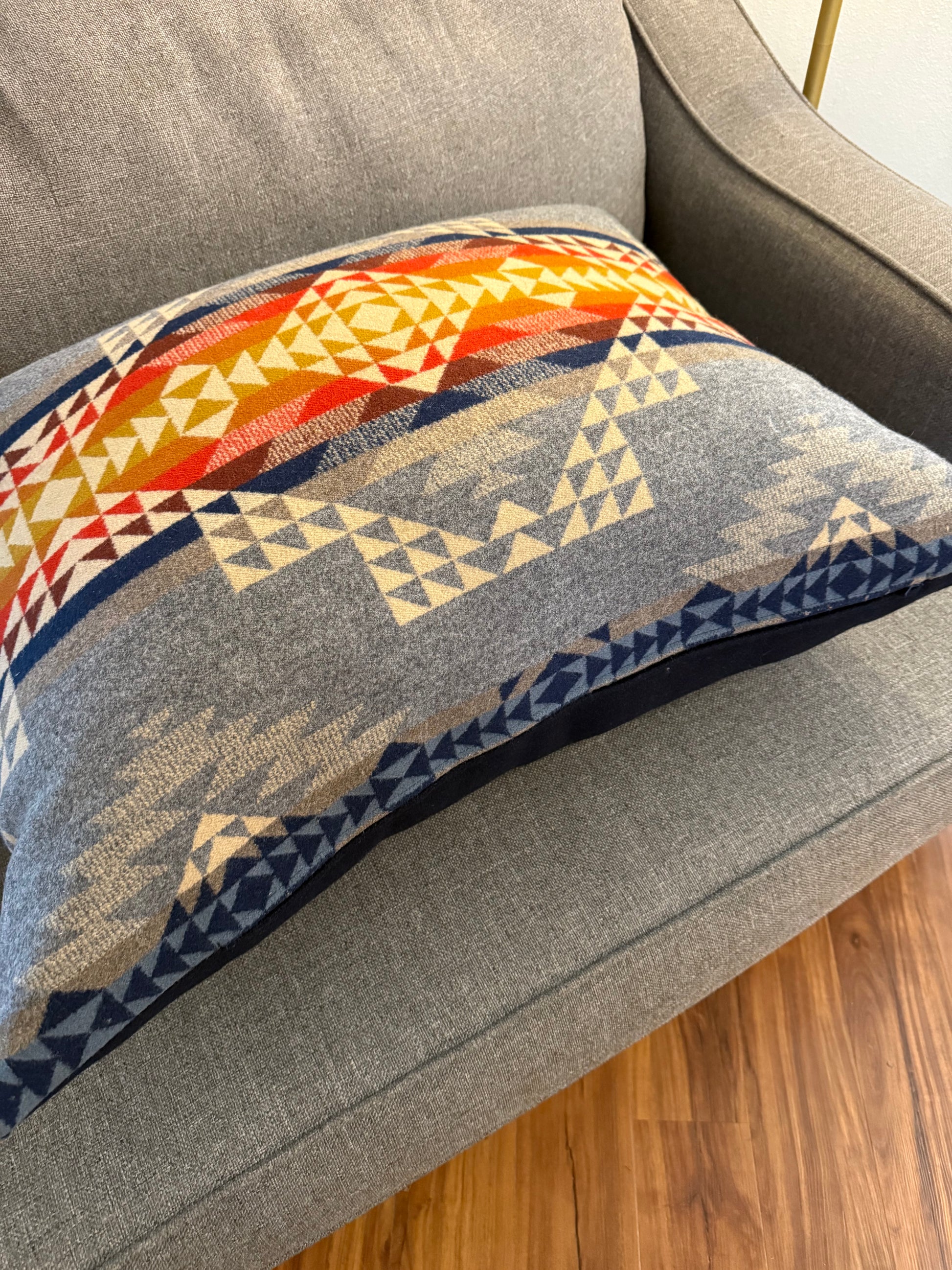 Large, cozy pillow made with Smith Rock and Navy Melton Pendleton® fabrics. This pillow has a YKK zipper and is stuffed with a 28x33 down alternative pillow insert. Spot clean or dry clean recommended. Two available, price is per pillow.