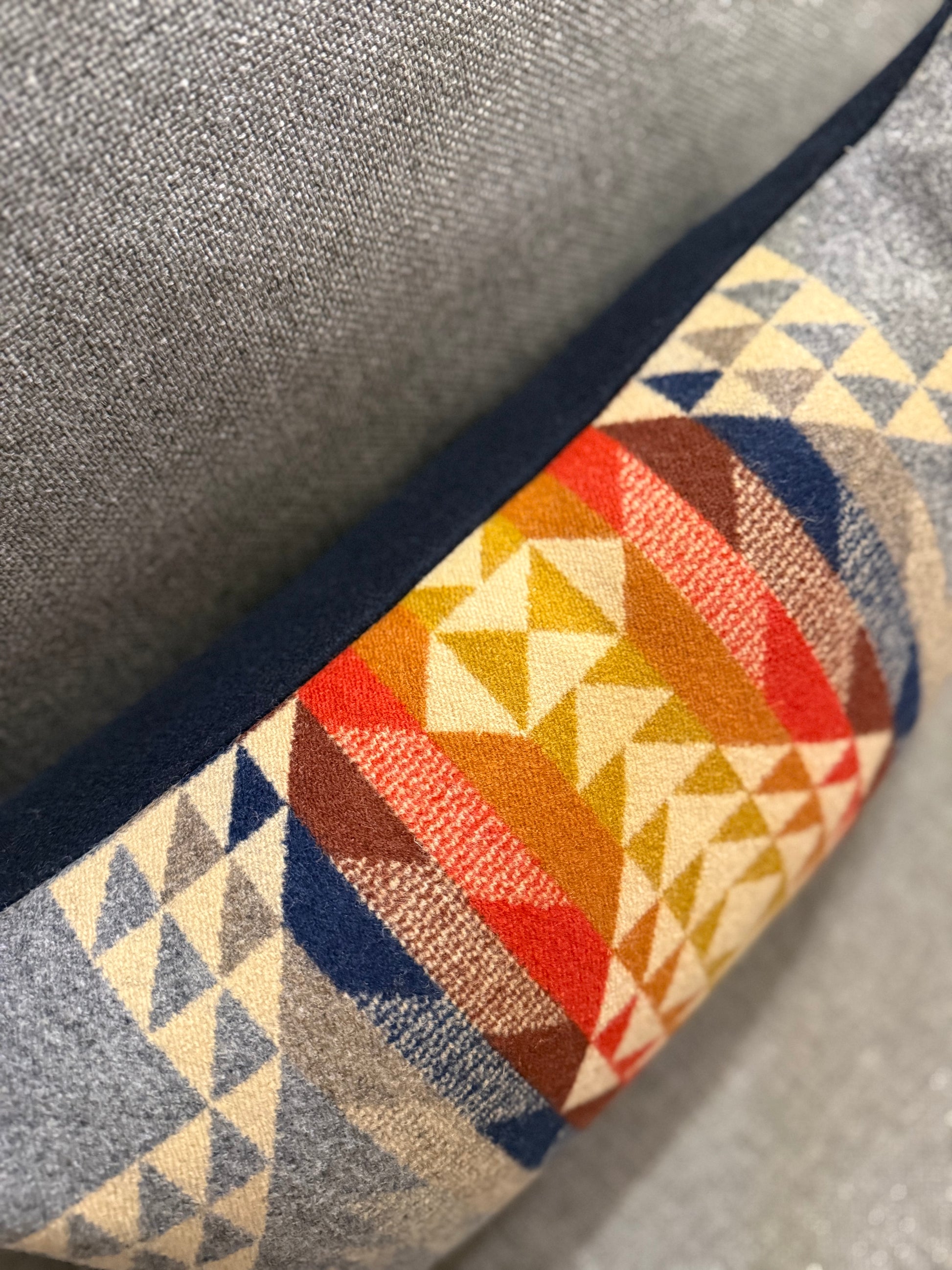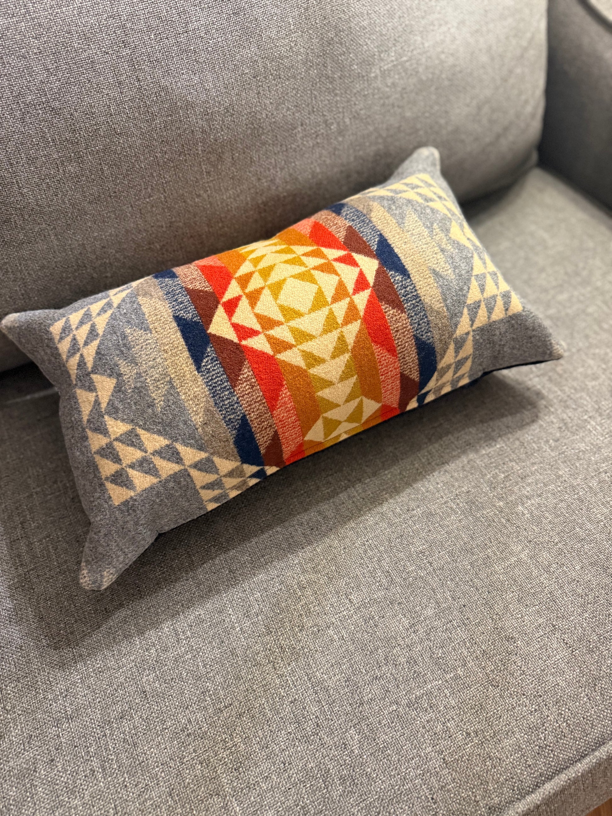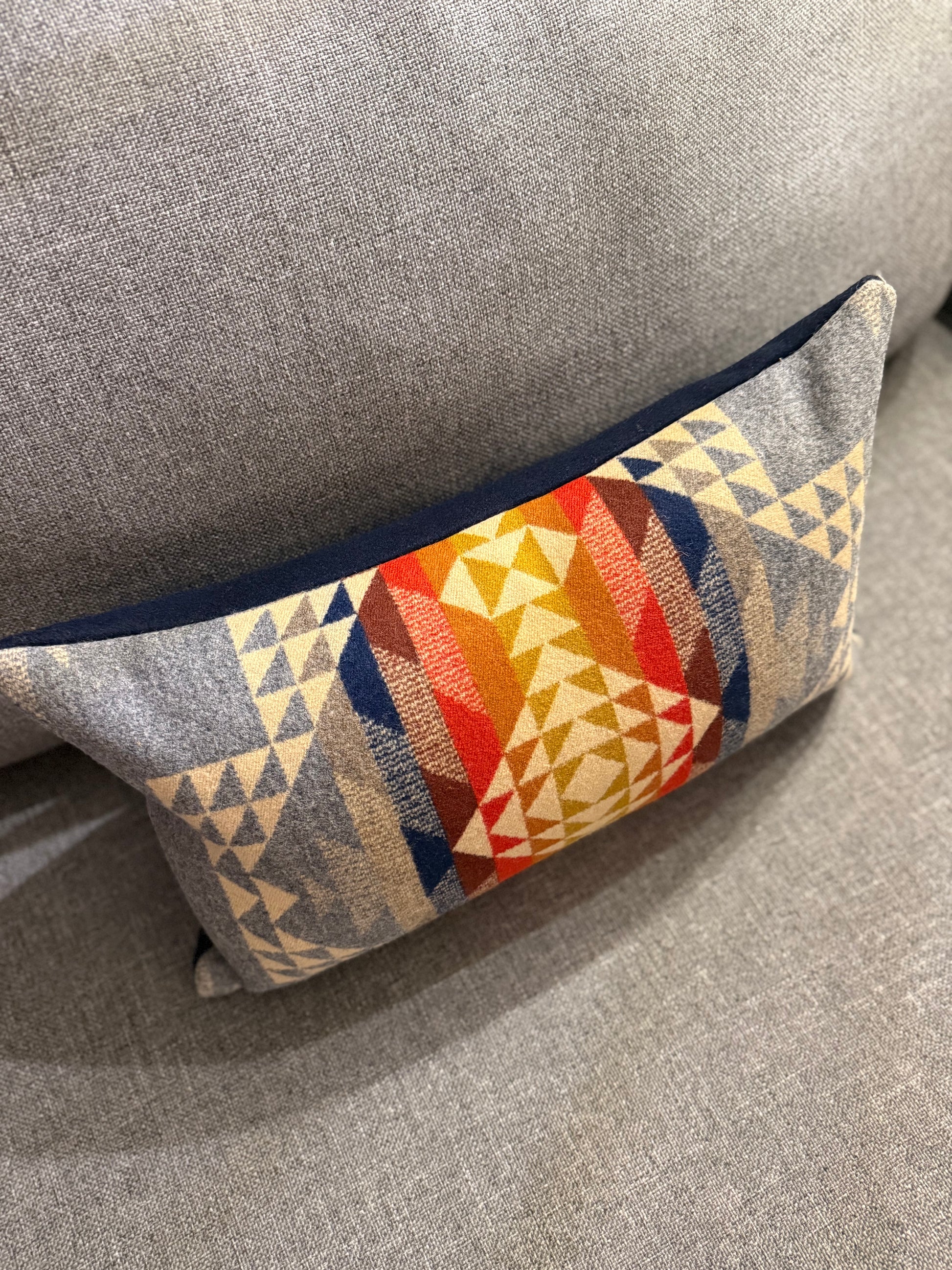 A cozy little pillow made with Smith Rock and Navy Melton Pendleton® fabrics. This pillow has a YKK zipper and is stuffed with a 12x22 pillow insert. Spot clean or dry clean recommended.