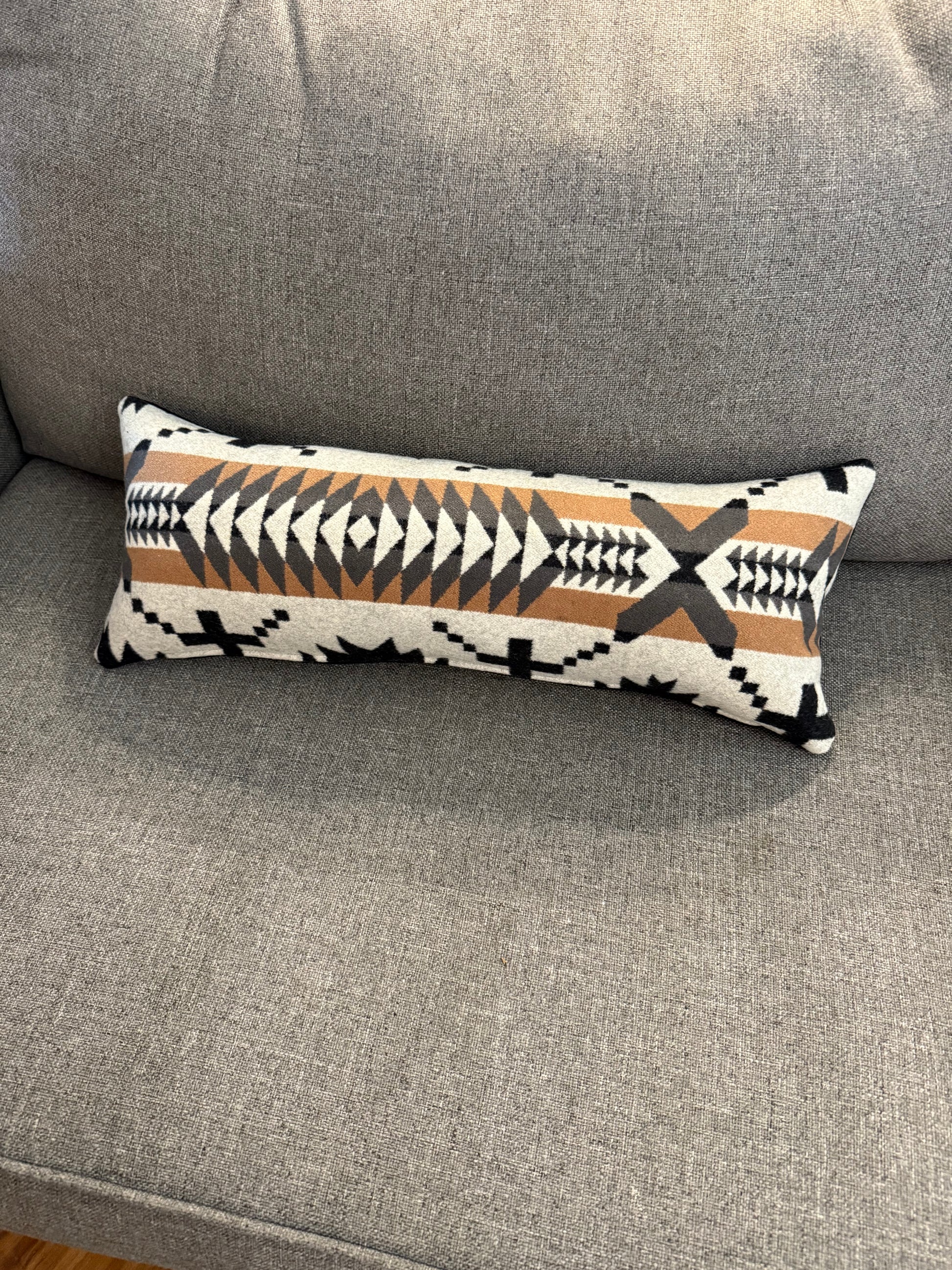 This lumbar pillow is approximately 10x24 and made with Spider Rock and Black Eco-Wise Wool Pendleton® fabrics. It has a YKK zipper and is hand-stuffed.