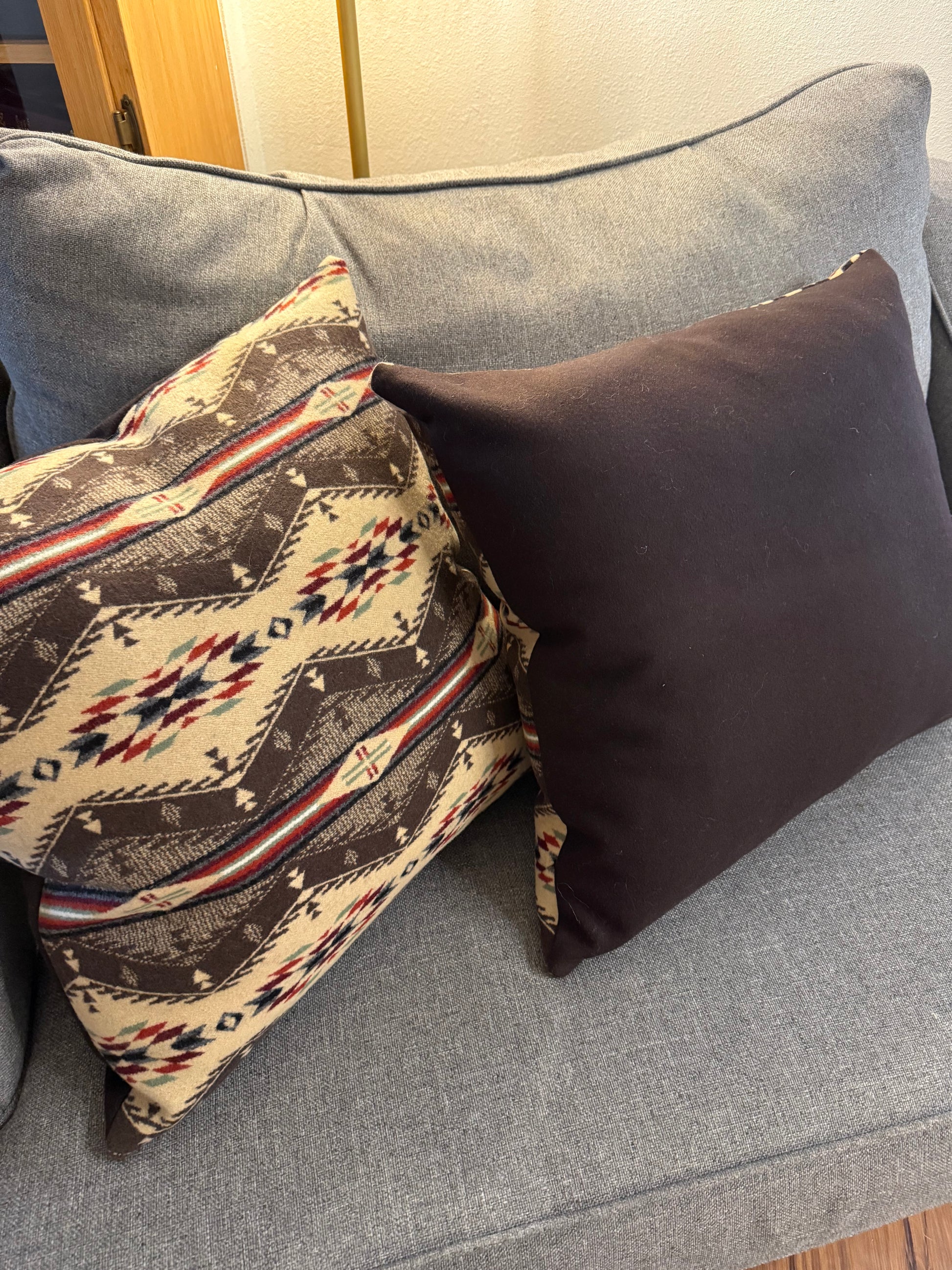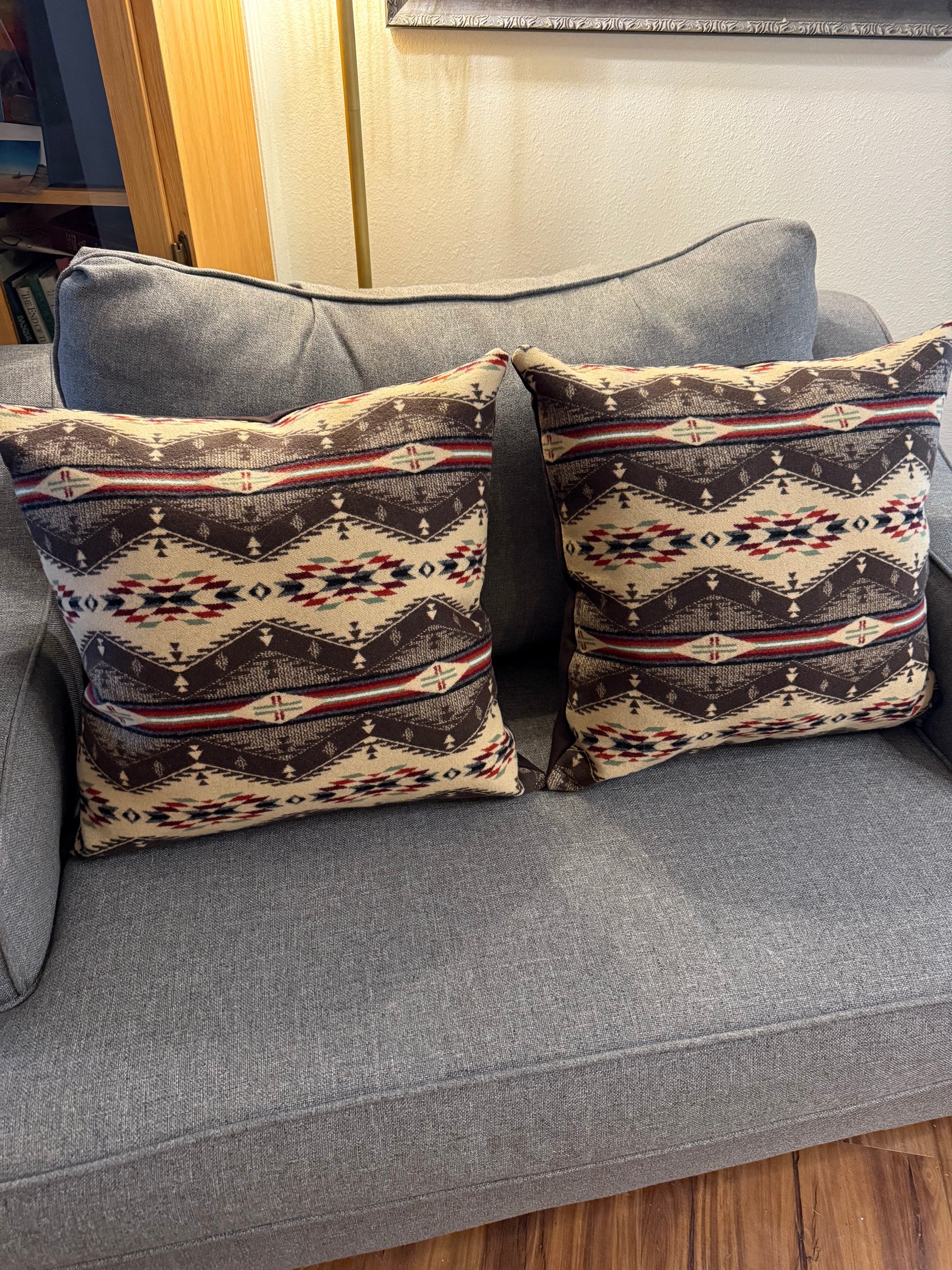 Set of two pillows made with Spirit of the People and Walnut Eco-Wise Wool Pendleton® fabrics. Each has a YKK zipper and is stuffed with a 24x24 pillow insert.