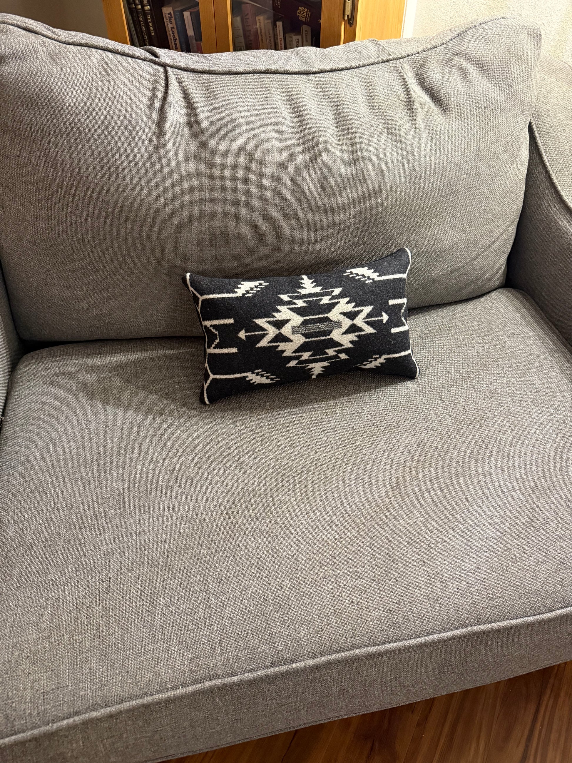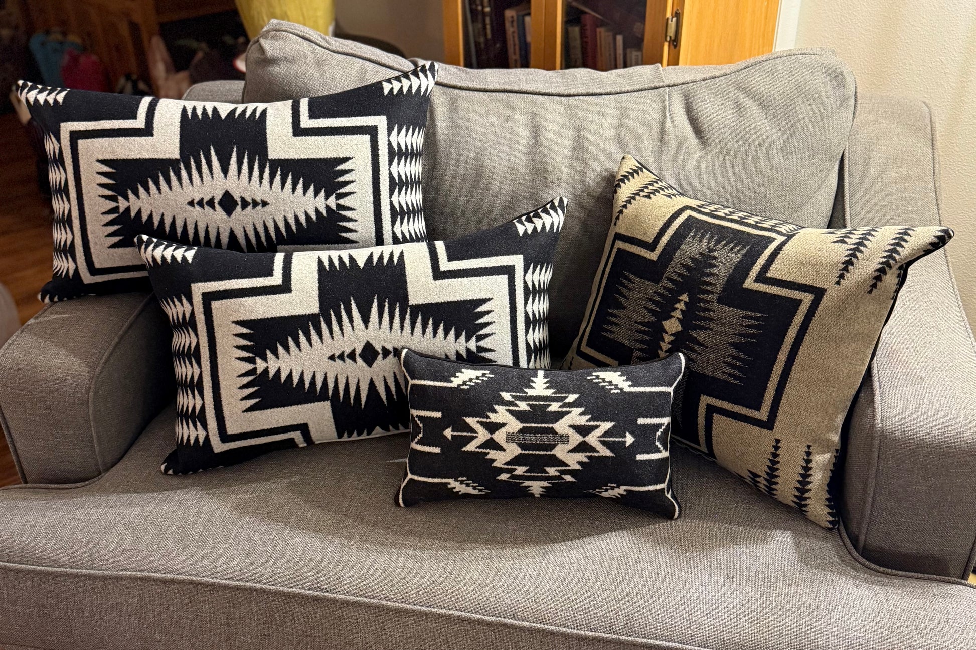 Beautiful little accent pillow made with Tsi Mayoh and Black Eco-Wise Wool Pendleton® fabrics. Has a YKK zipper and hand stuffed with cluster-poly. This pillow is approx. 10x16 inches.