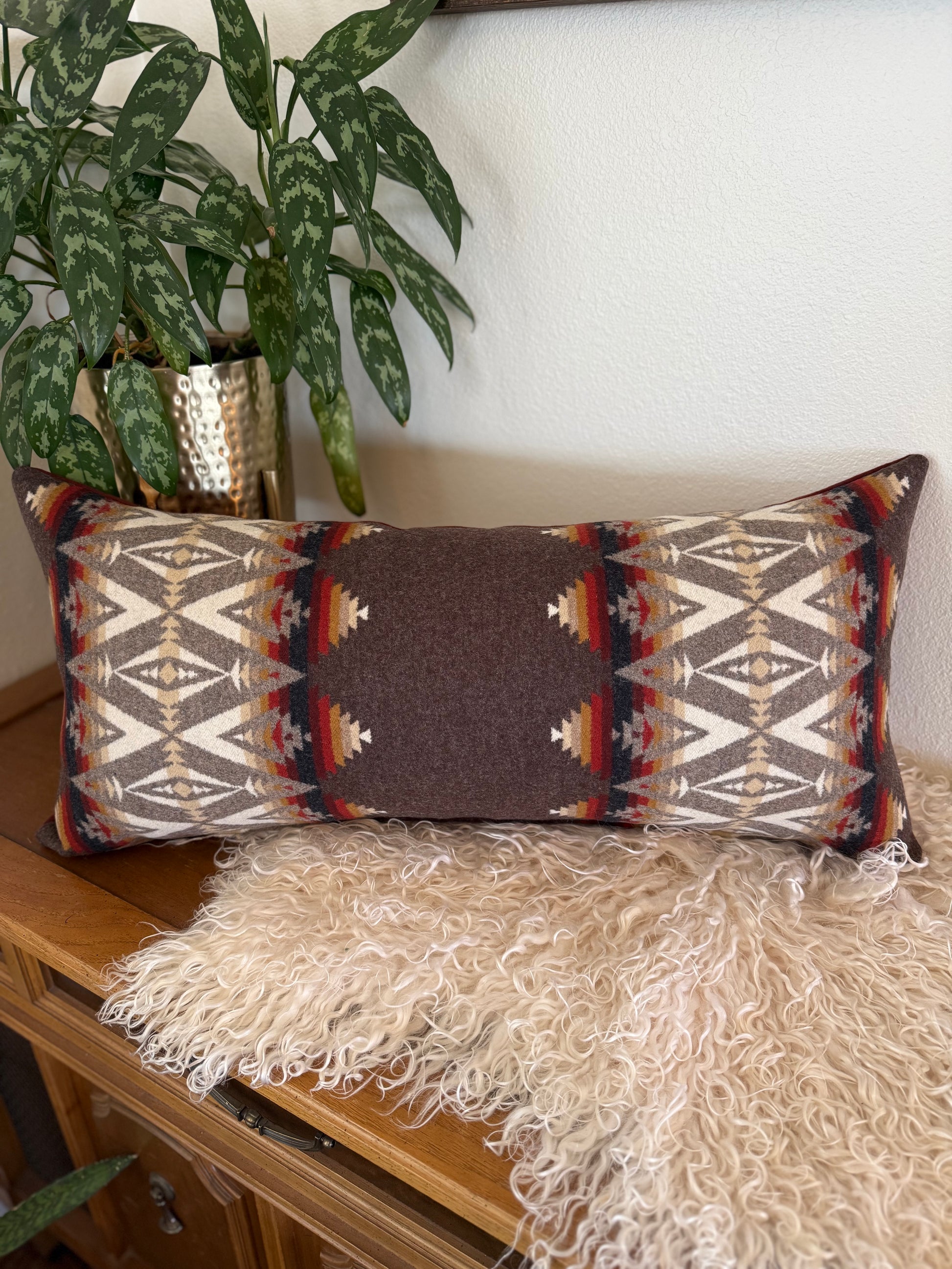 A long lumbar pillow made with Pendleton® Pacific Brown Crest and Tobacco Eco-Wise wool fabrics.