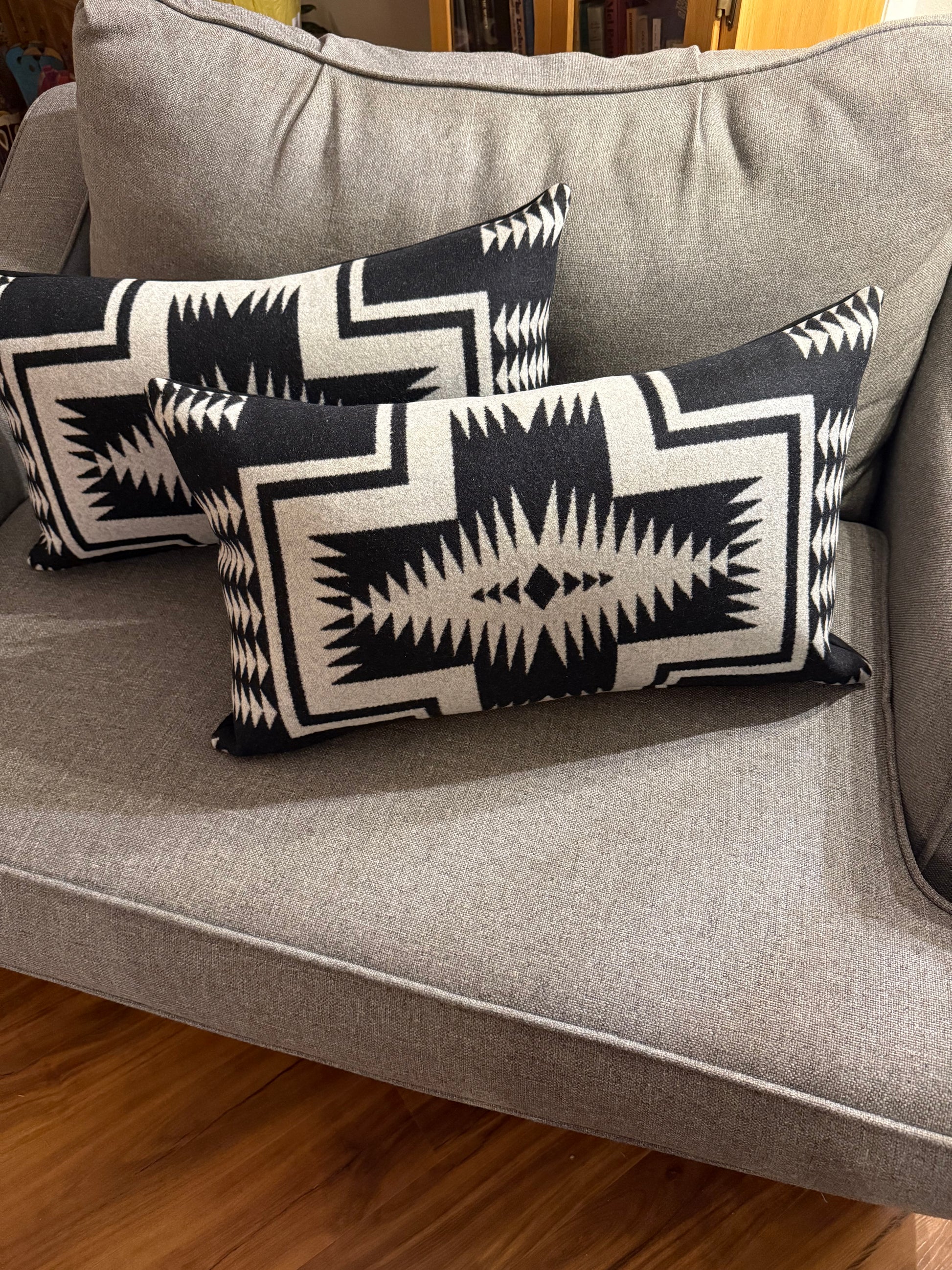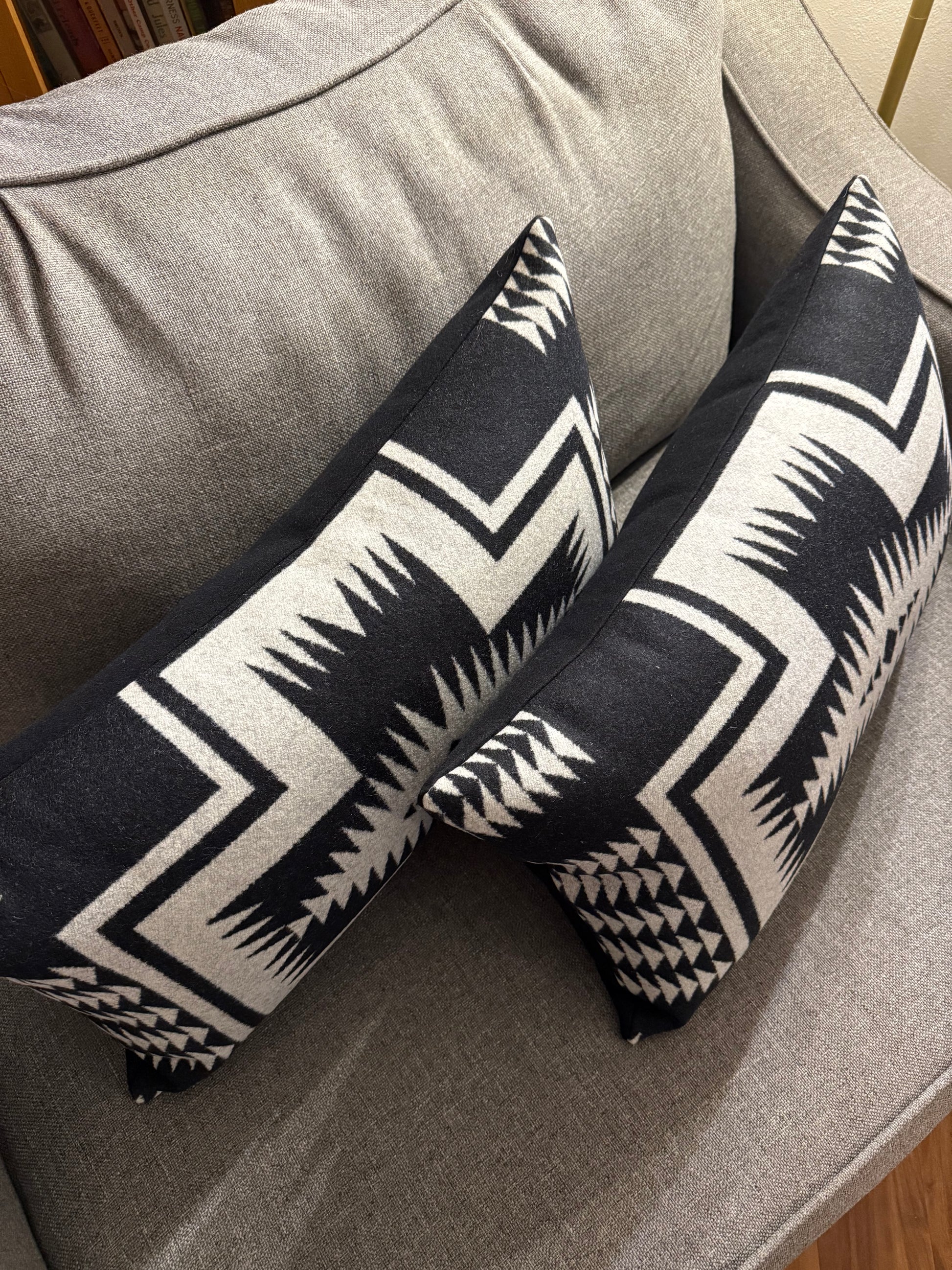 These pillows are made with Walking Rock and Black Eco-Wise Wool Pendleton® fabrics. Each pillow has a YKK zipper and is stuffed with a queen size insert. Dry clean recommended.