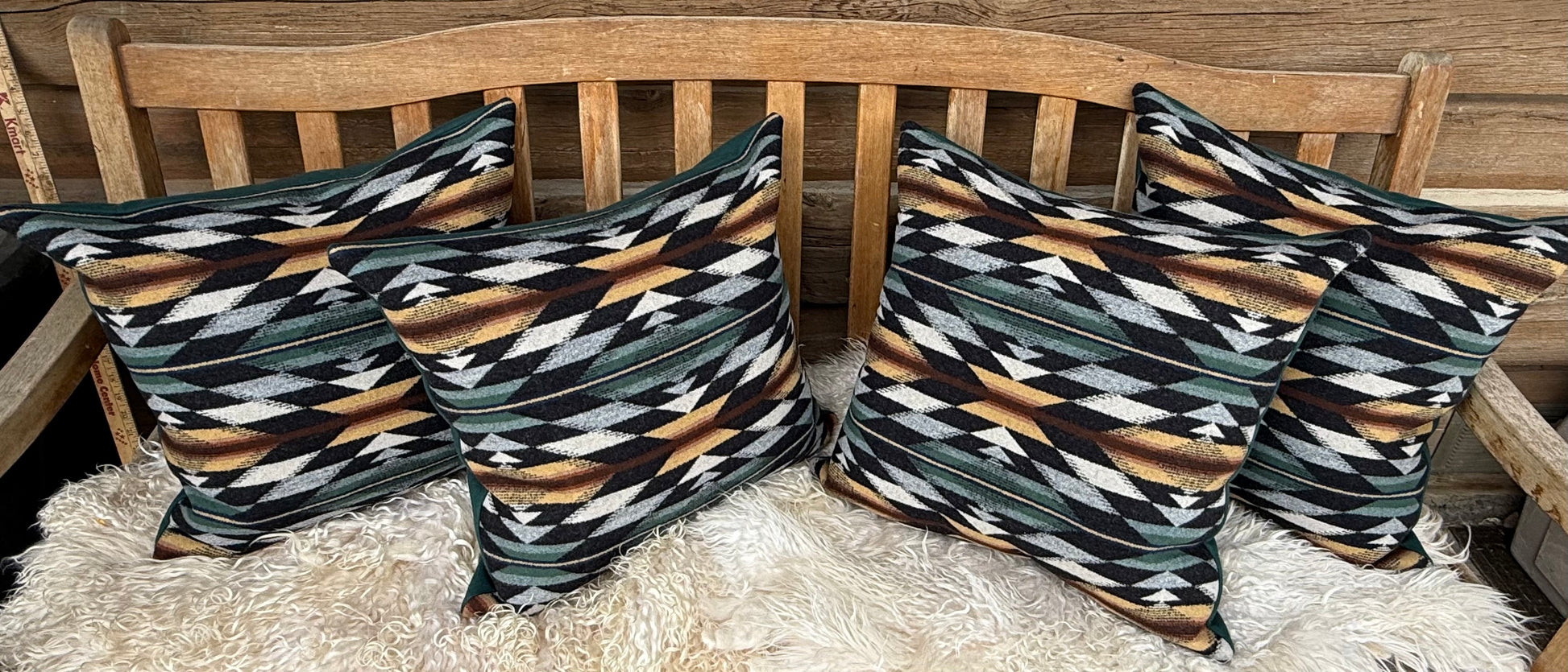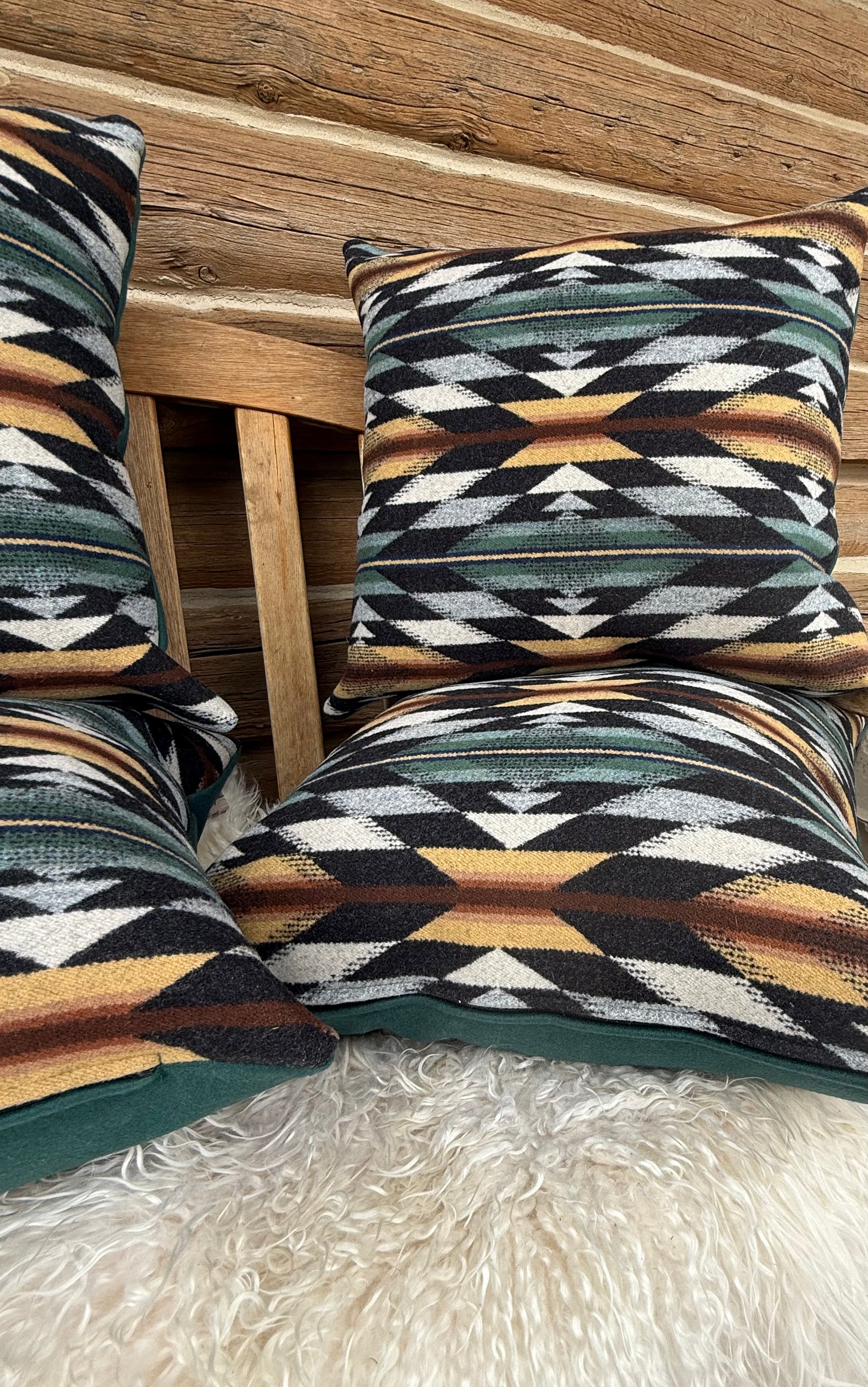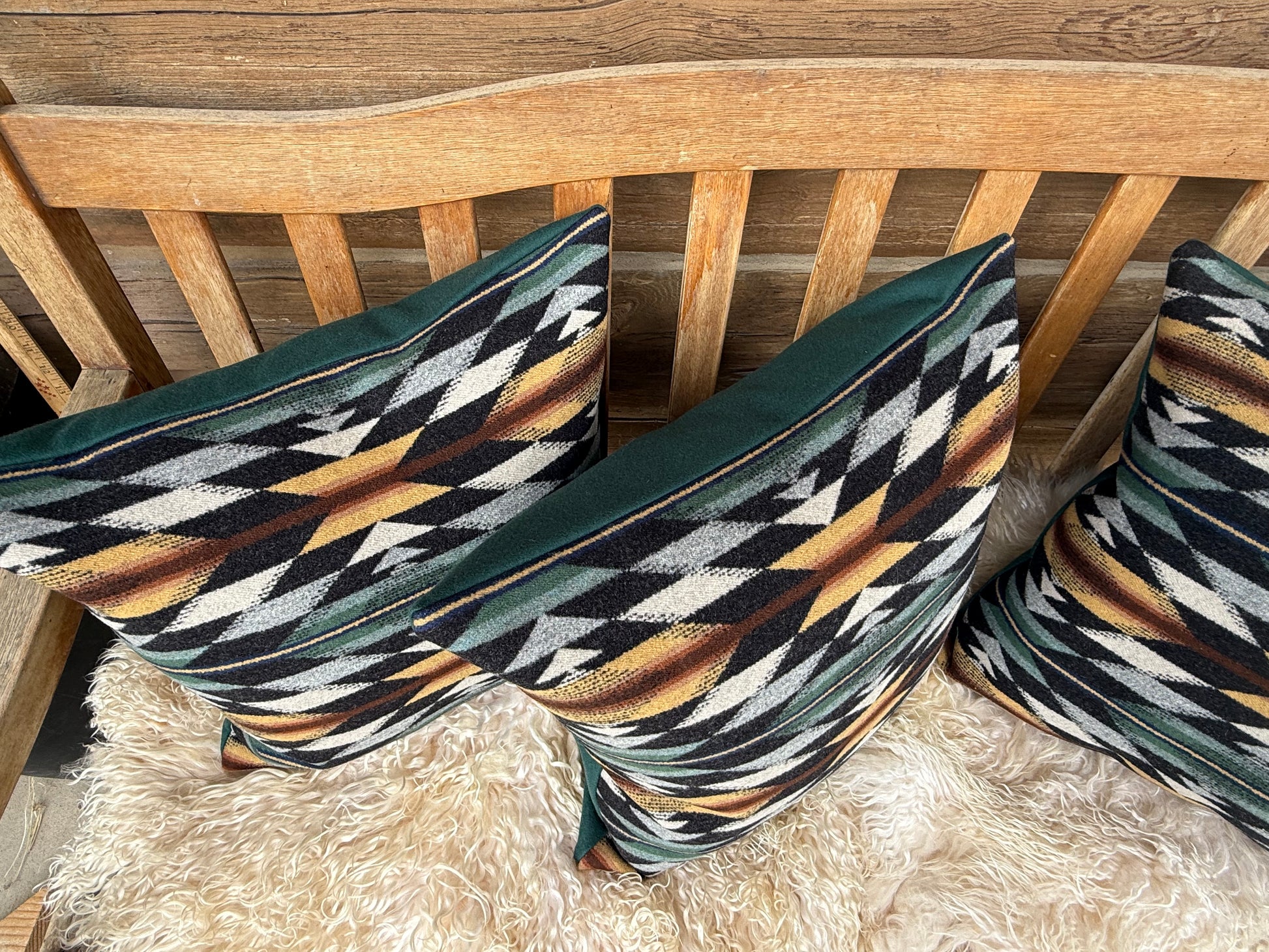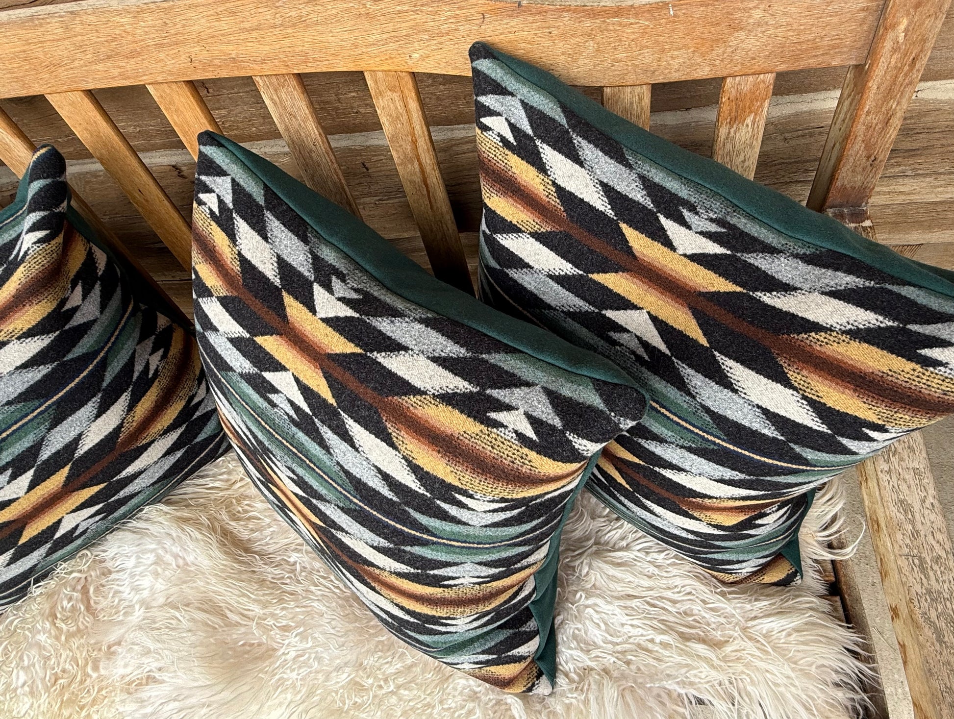 Beautiful colors, perfect for fall! Each set has two pillows made with Wyeth Trails Oxford and Caspian Eco-Wise Wool Pendleton® fabrics. Each pillow has a YKK zipper and is stuffed with a 20x20 pillow insert. 2 sets available!