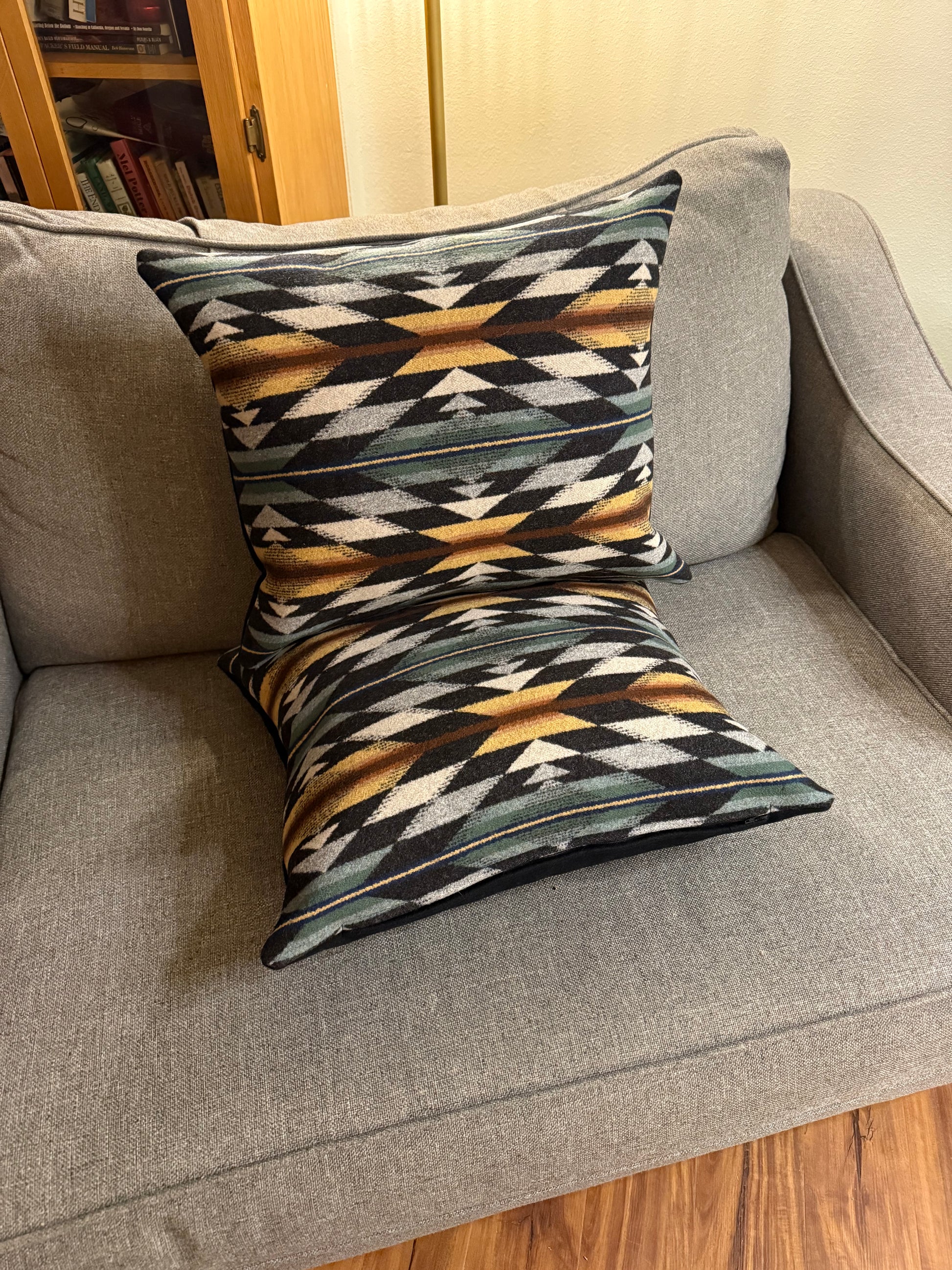 This set of two pillows has been made with Wyeth Trails Oxford and Black Eco-Wise Wool Pendleton® fabrics. Each pillow has a YKK zipper and is stuffed with a 20x20 pillow insert.